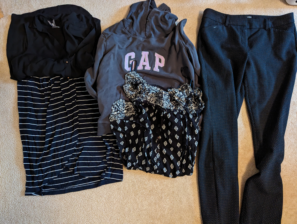 Over 50 pieces of woman's clothes. Sizes range from small to medium. Photo only shows a few pieces, I couldn't take pics of all. Brands such as Gap, Express, Dynamite. There are t-shirts, dresses, skirts, dress pants, tops, pants, romper, etc. All in good condition. Giving away as I no longer fit in them anymore. Porch pickup: Markham West (Bayview / John Street)