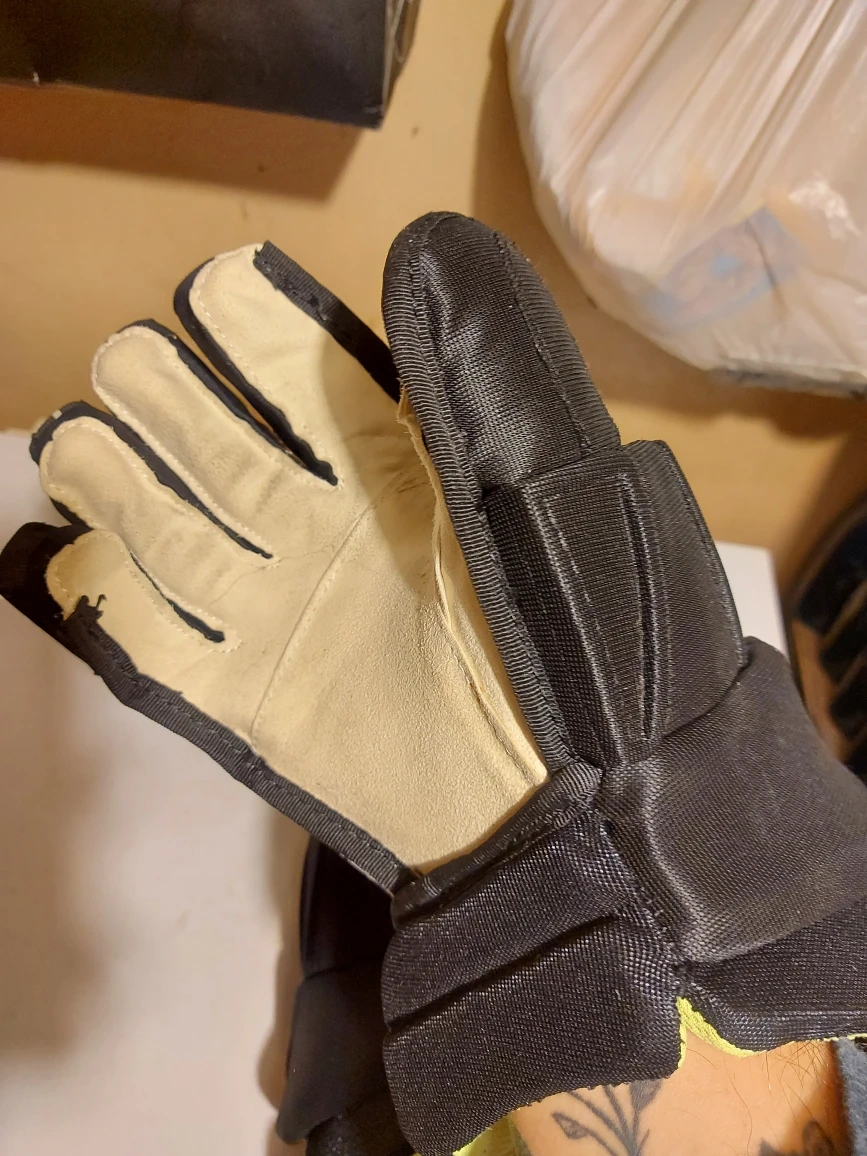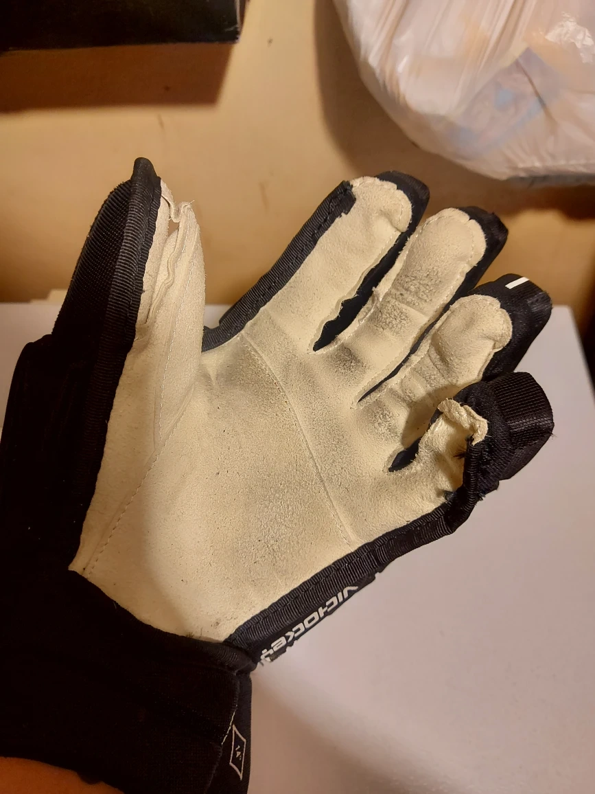 Still in good condition. Padding is still hard. Not flimsy at all. Just dirty palms from hockey tape.