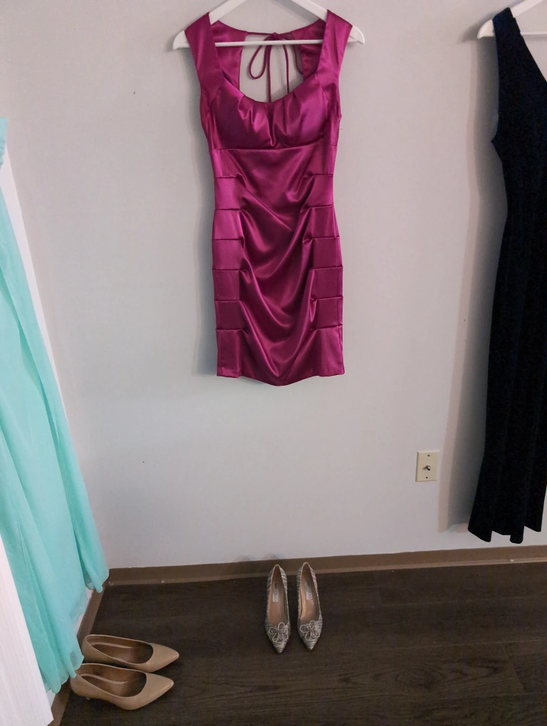 Dress - magenta in satin with pleating all the way down front. Can be worn for any event or party or a night out for dinner. Size extra small.