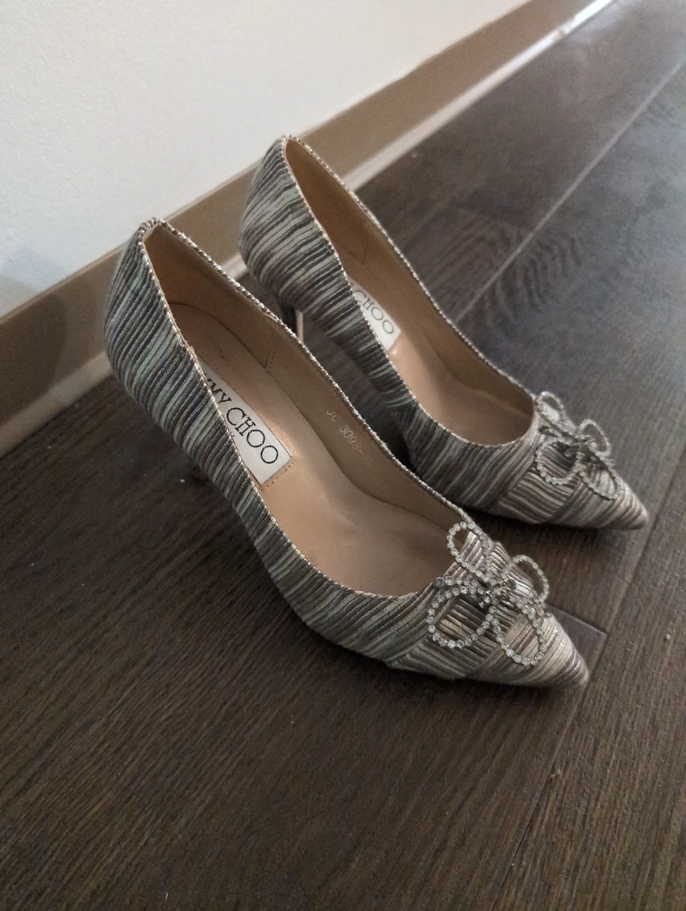This dress features caplet sleeves with a beautiful back shape opening. The skirt is just above the knee and is fitted. The shoes are Jimmy Choo and match the elegance of the dress. They are size 5.5. There is another beige medium heal shoes size 8 that would go with it.