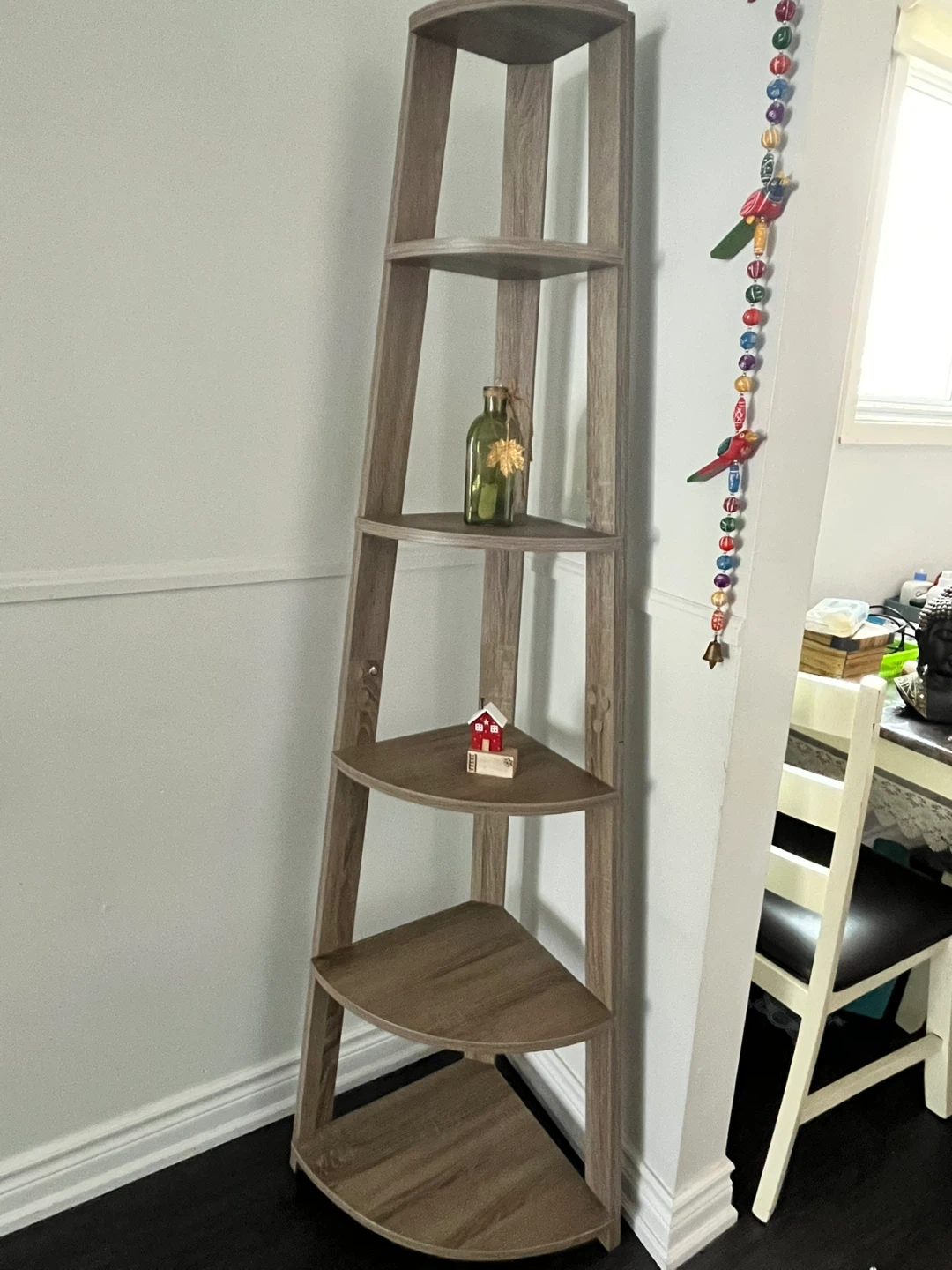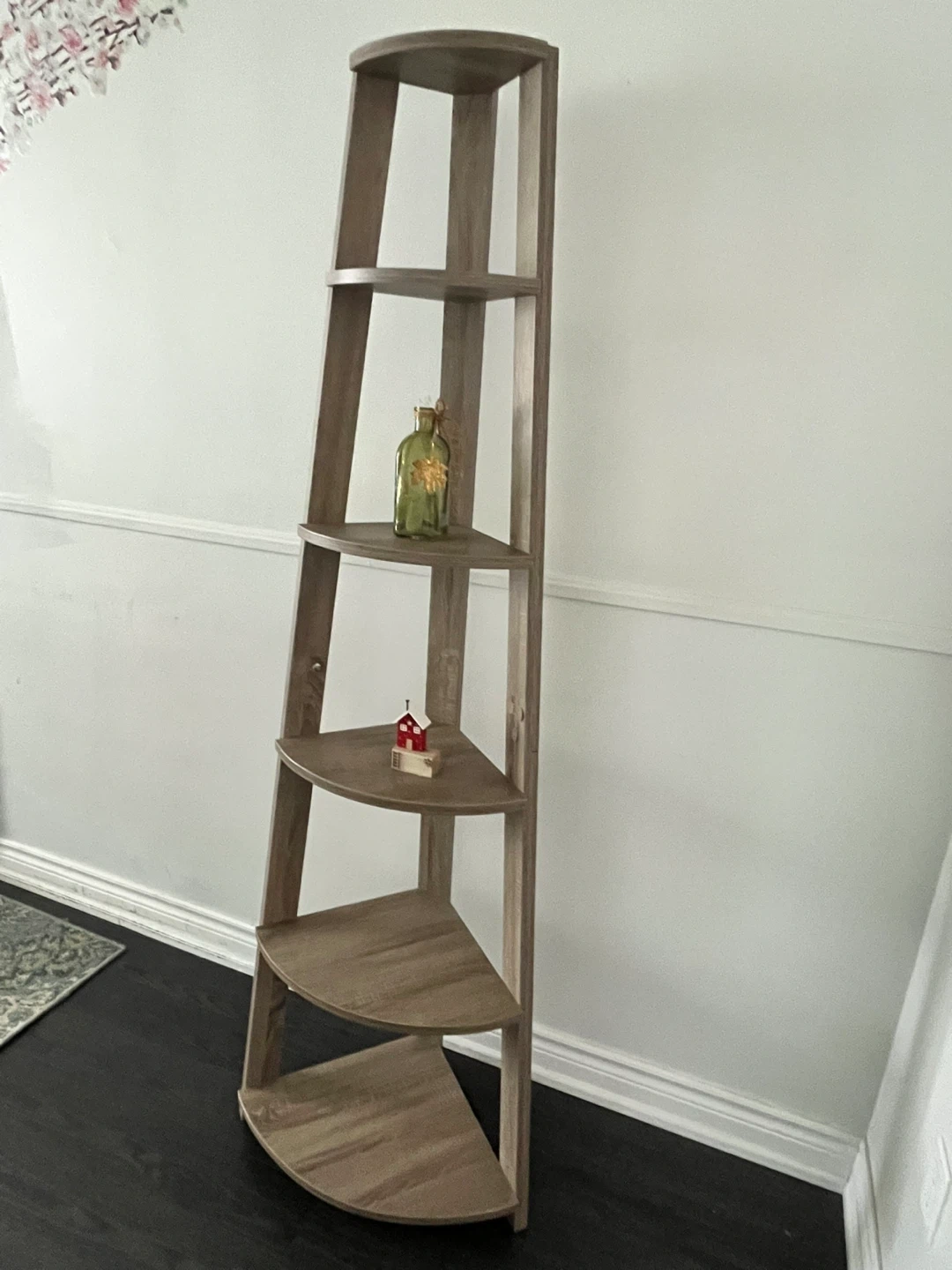 This is a tall, five-tier corner shelving unit. It's made of a wood-look material in a light brown or greyish-brown tone. The shelves are quarter-circle shaped to fit neatly into a corner. It's great for displaying decor or storing small items!