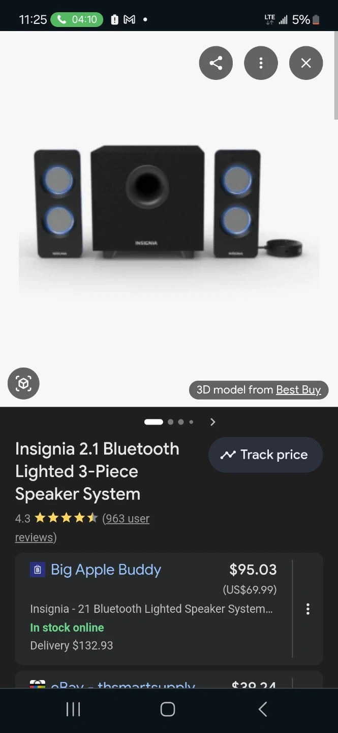 This Insignia 2.1 Bluetooth speaker system comes with a subwoofer and two satellite speakers. It features Bluetooth connectivity for wireless streaming. The speakers are lighted, adding a visual element to your audio experience.
