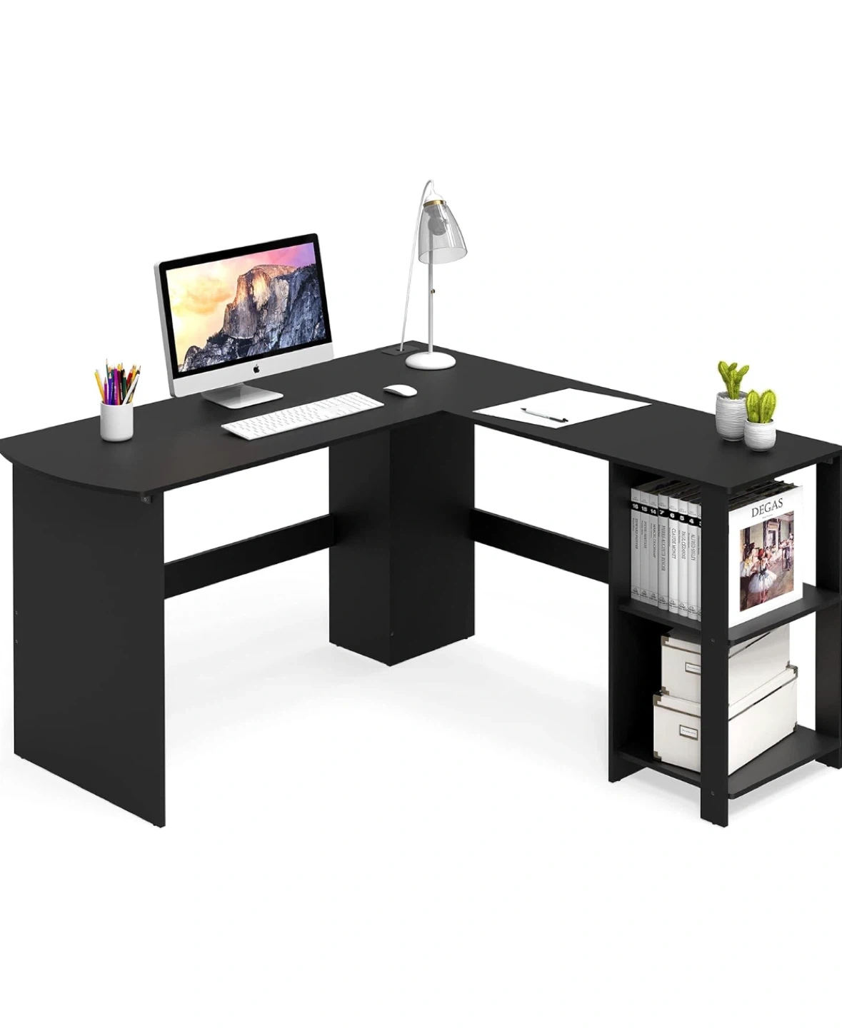 This SHW Cyrus L-shaped corner desk comes in an espresso finish. It has integrated shelves for storage. The desk dimensions are approximately 51" x 51" on each side, with a depth of 19.7" and a height of 28.3".