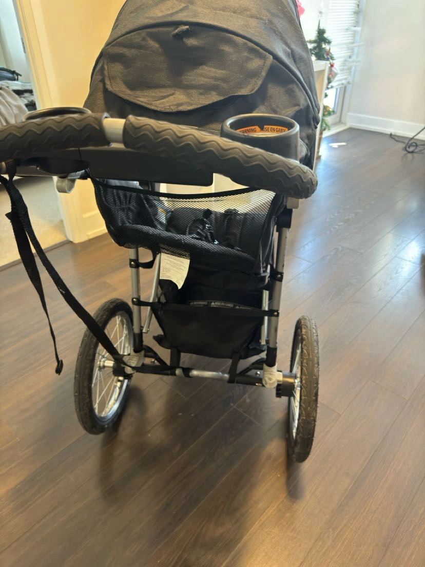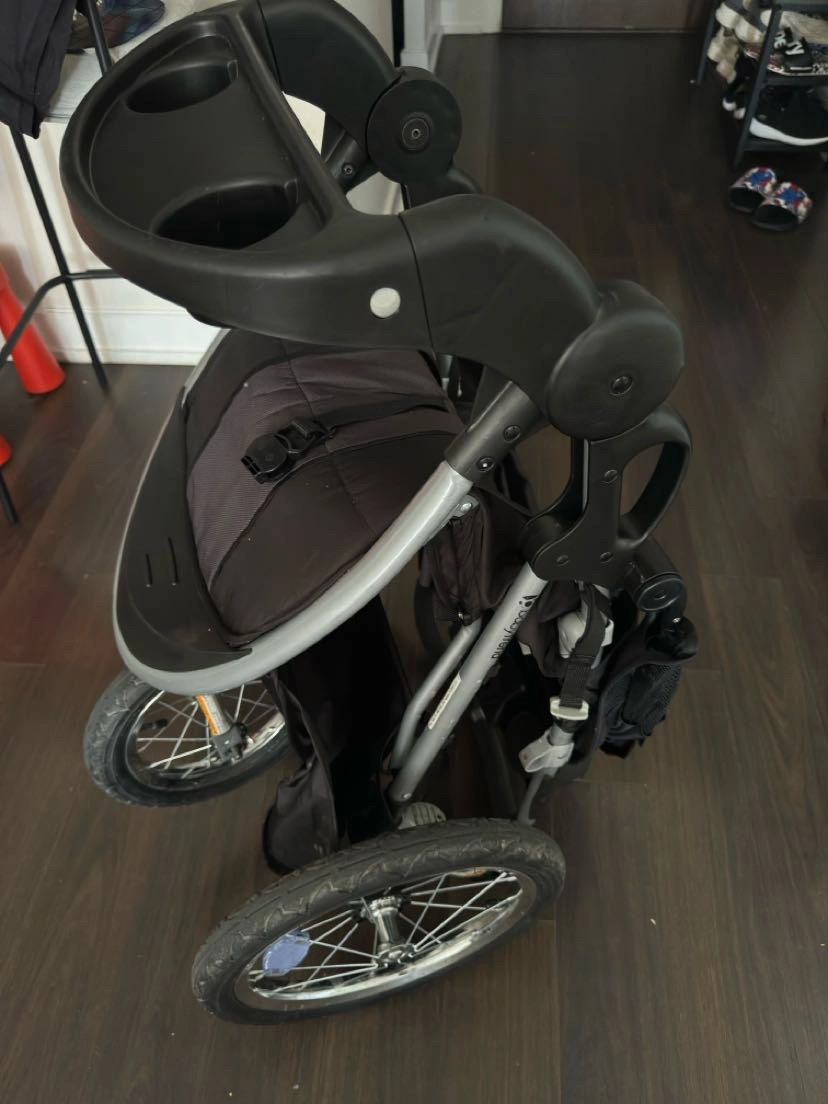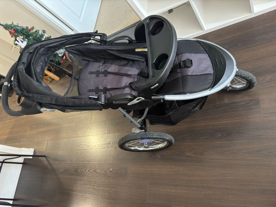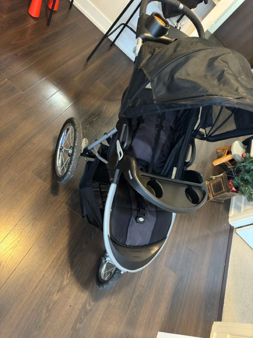 Stroller is in excellent condition, hardly used by my toddler, as she is grown up now. Brand is Baby trend. It features a parent tray with 2 cup holders and covered storage compartment and an extra-wide ergonomically shaped rubber grip for comfortable handling. The child's tray has 2 cup holders to keep beverages and snacks handy. The jogger also includes a 5-point harness and an extended canopy with a peek-a-boo window. It has a convenient storage basket under the seat, offering ample space to carry feeding bottles or other baby essentials. The stroller easily folds into a compact unit for easy storage. Its front wheel swivels for easy maneuvering. The wheel can also be locked to offer in-line performance when jogging.