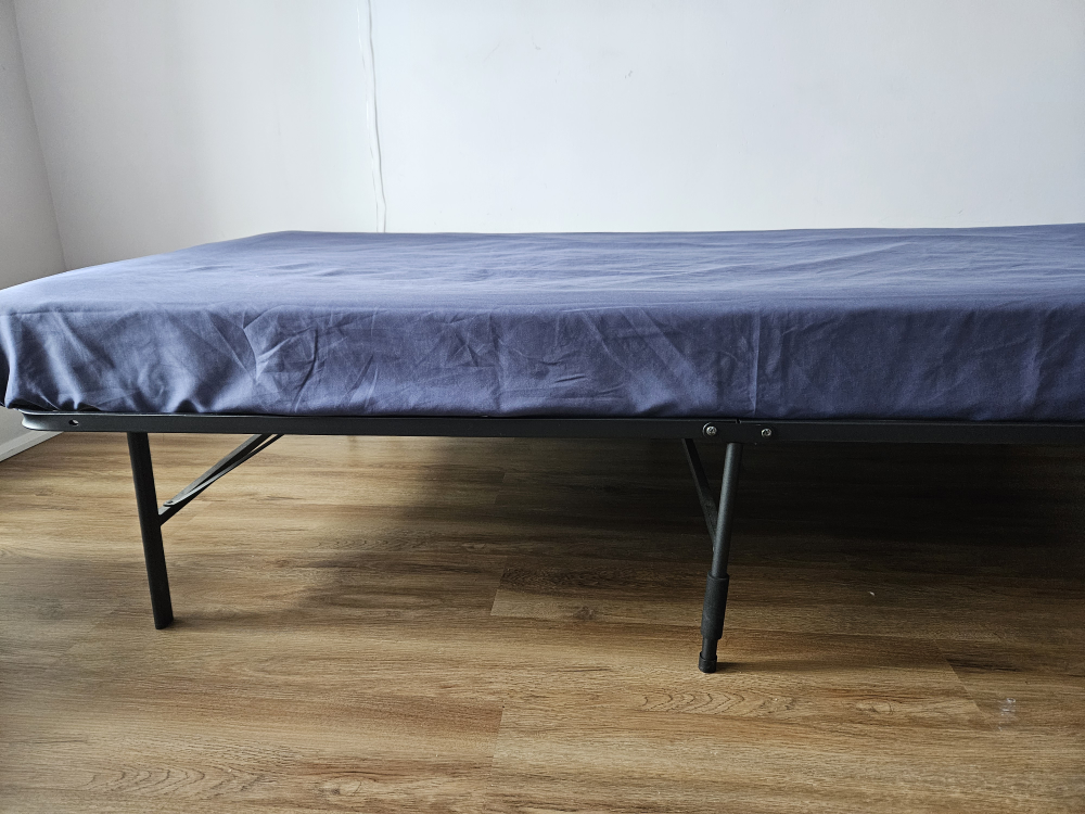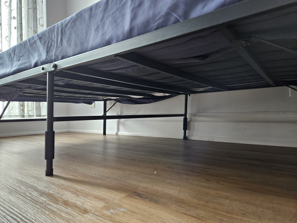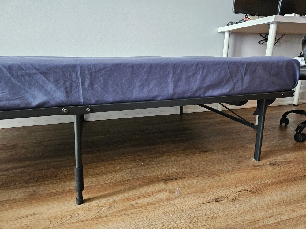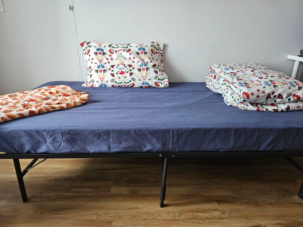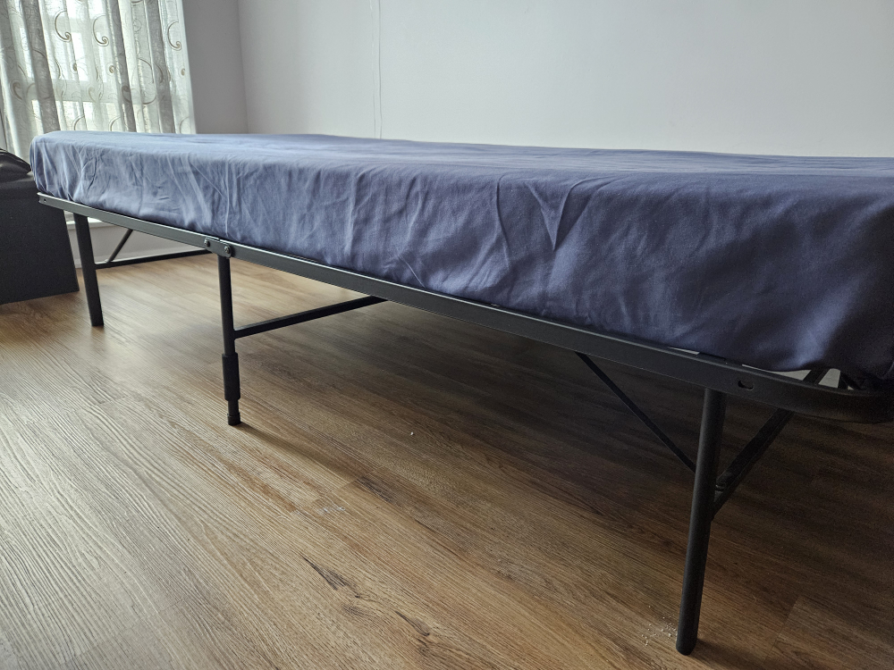 I'm selling this metal twin bed frame along with mattress as I've to replace it and buy something else. Bed frame is metal which I bought from amazon - https://a.co/d/9Q2U81O mattress is 6 inch bought from amazon - https://a.co/d/auLm7Zi bed sheet and pillow shown is pictures is also available in the price. pilow cover not included.