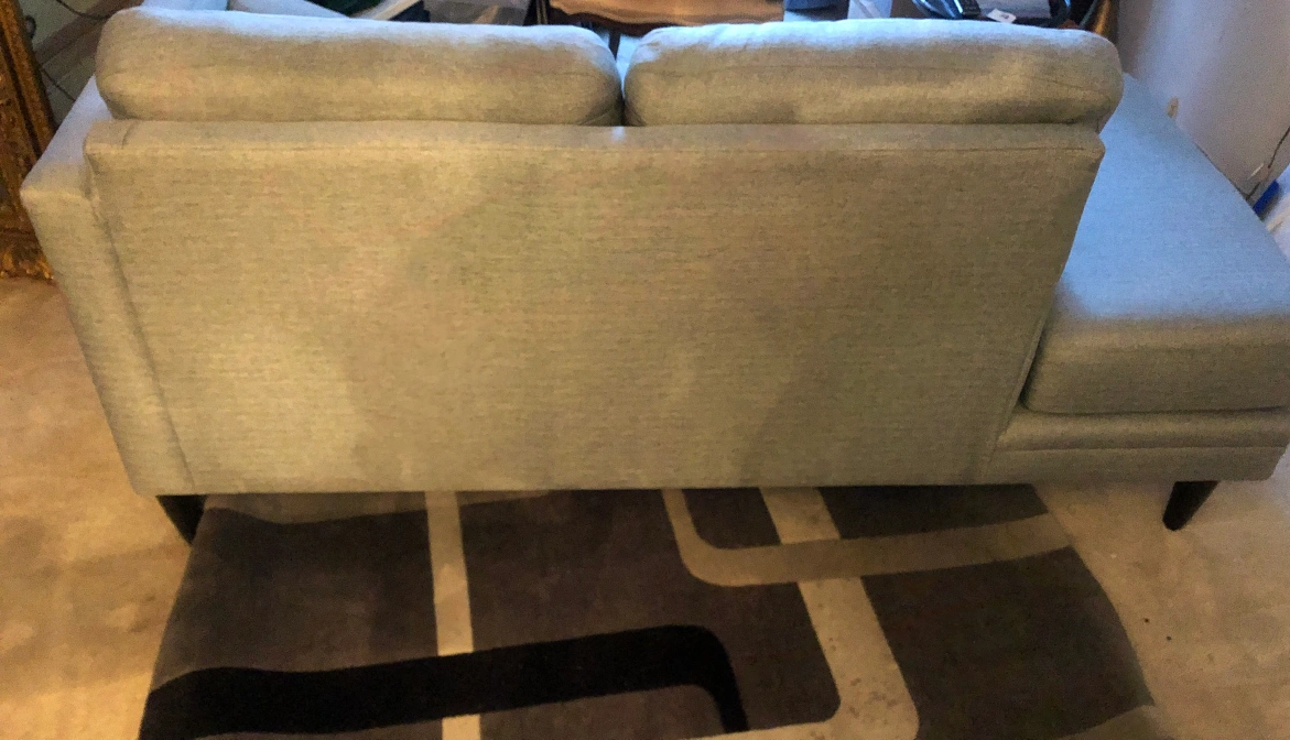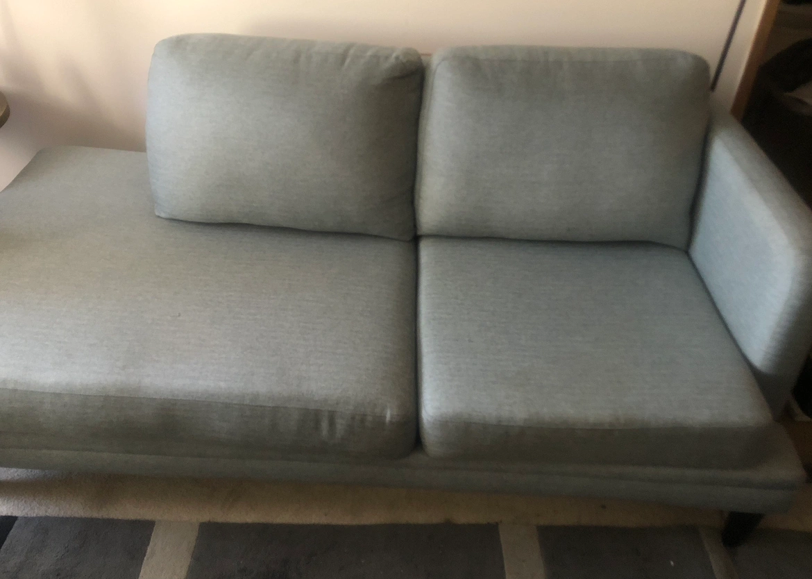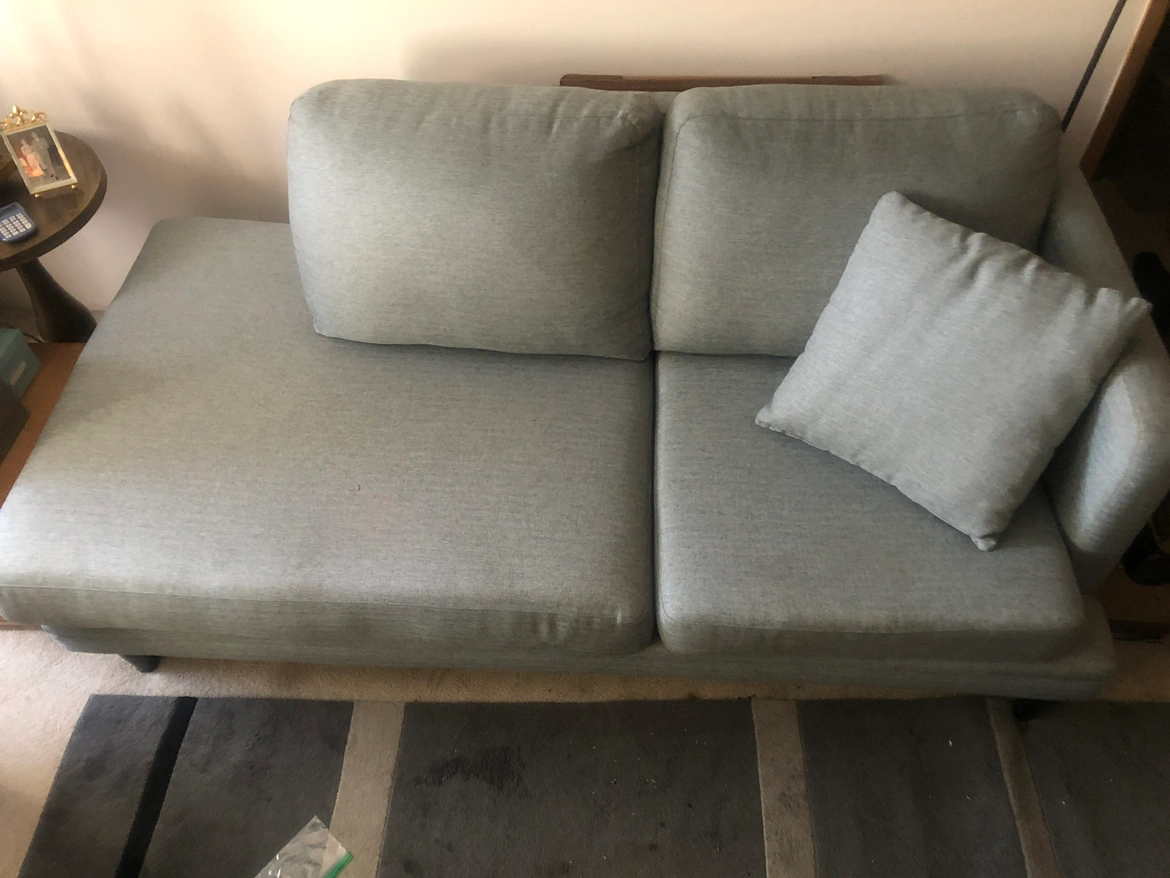 Like new firm cuishions light blue grey Chaise Lounge Style sofa. Excellent condition. Smoke free and pet free. ( free delivery, gauranteed or money back if you are not satisfied after 2 days ).