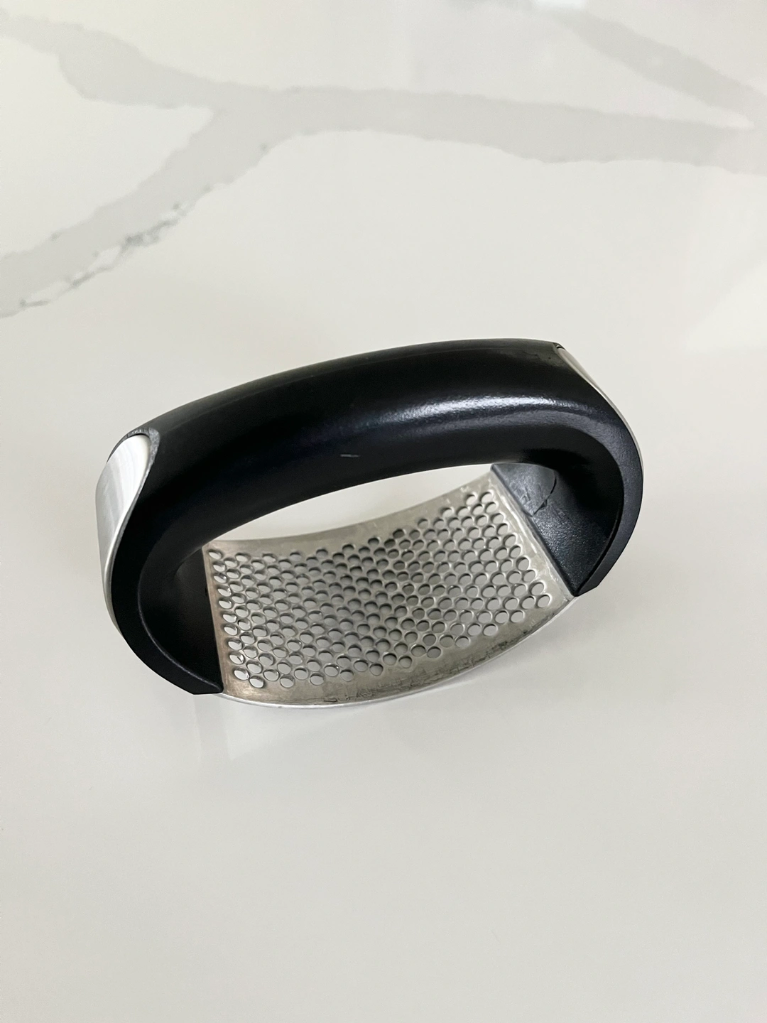 KSP (kitchen stuff plus) rocker garlic press. Just rock back-and-forth on your garlic with this simple, stainless steel tool and you'll have perfectly pressed garlic in moments. Dishwasher safe and easy to clean.