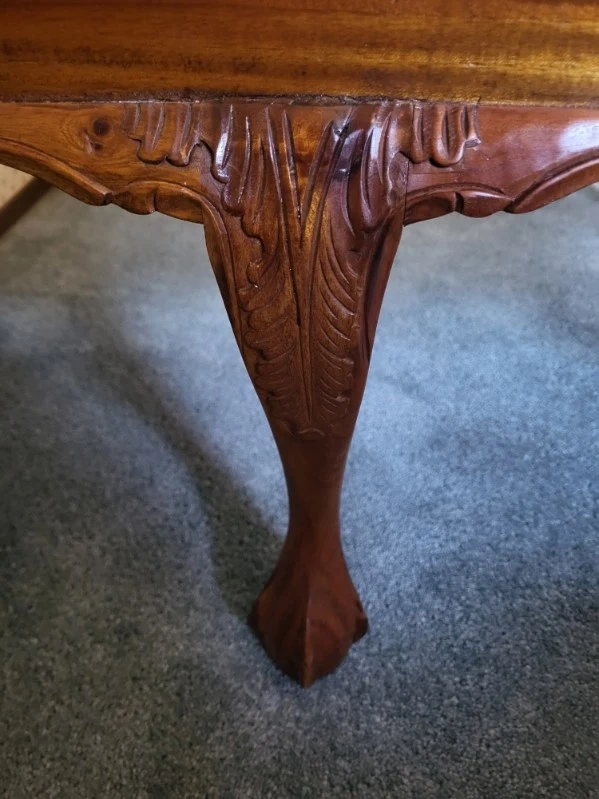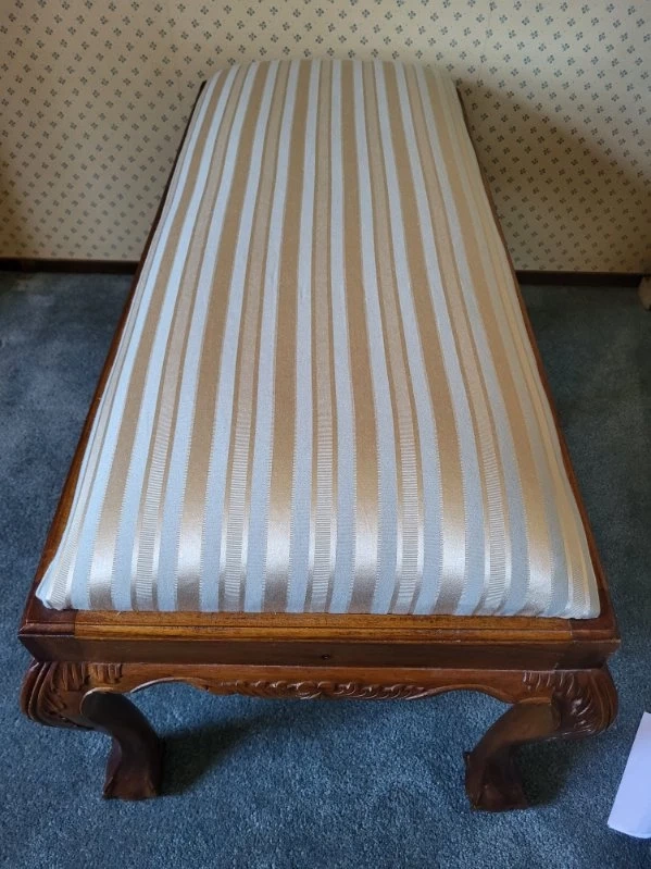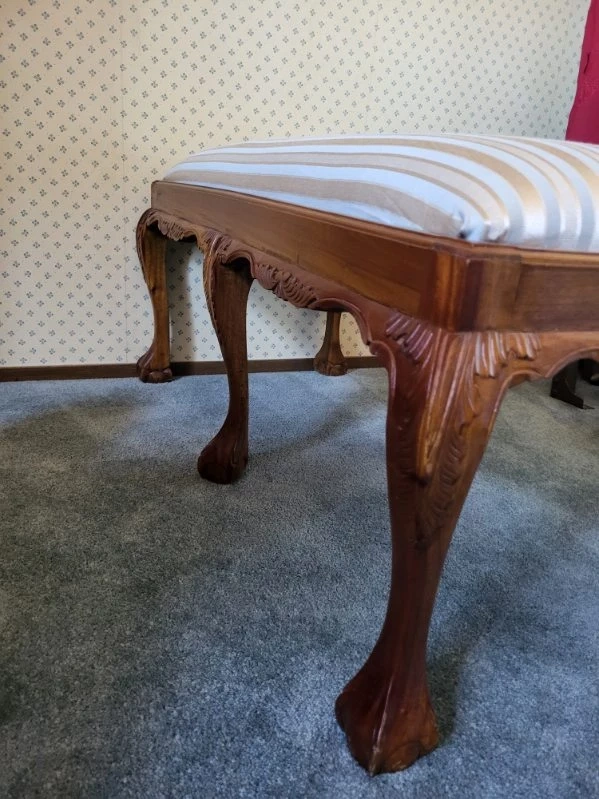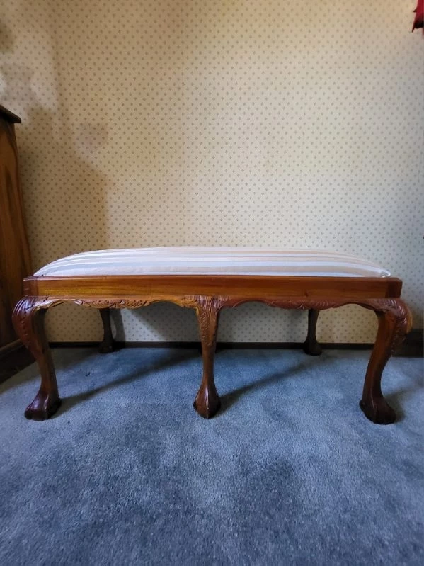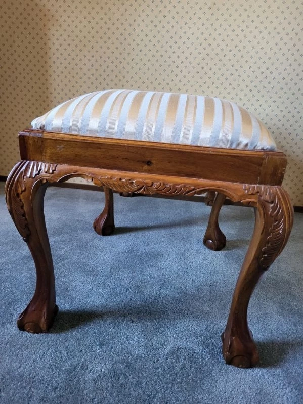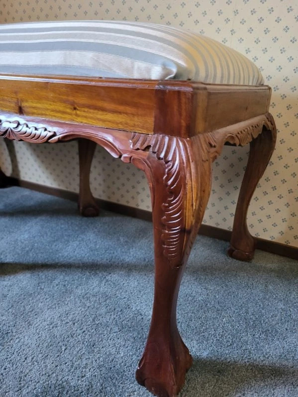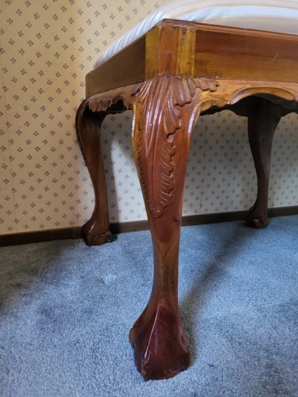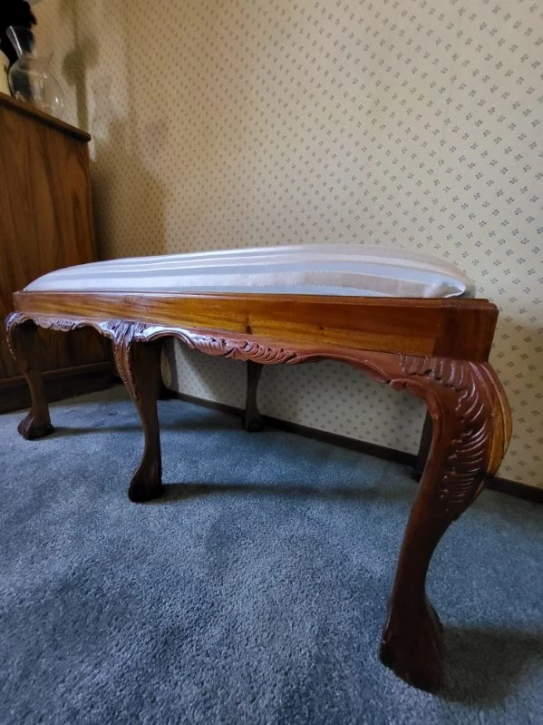 Beautiful Hand Carved design. Not sure what type of wood. Does have a few scratches and nicks. Hardly noticeable. Very well built and sturdy. Note: The last photo is the original cover on seat. is under the new fabric cover.