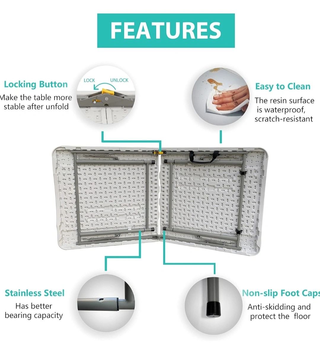 Sturdy and Durable Frame: The resin surface of the folding utility table is waterproof, scratch-resistant, and impact-resistant, making this table easy to clean. The honeycomb panel design and triangular locking legs enhance the load-bearing capacity of the desktop.