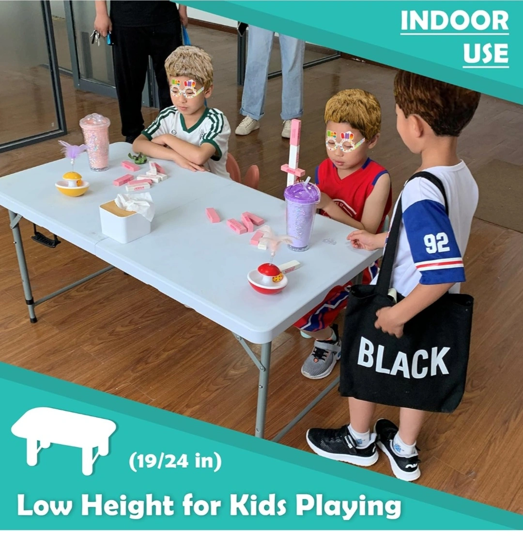 Lightweight and Compact: Easily folds and unfolds for storage. Folds neatly in half with a convenient carrying handle for easy transportation and compact storage. This fold up table has enough room for 6 adults
