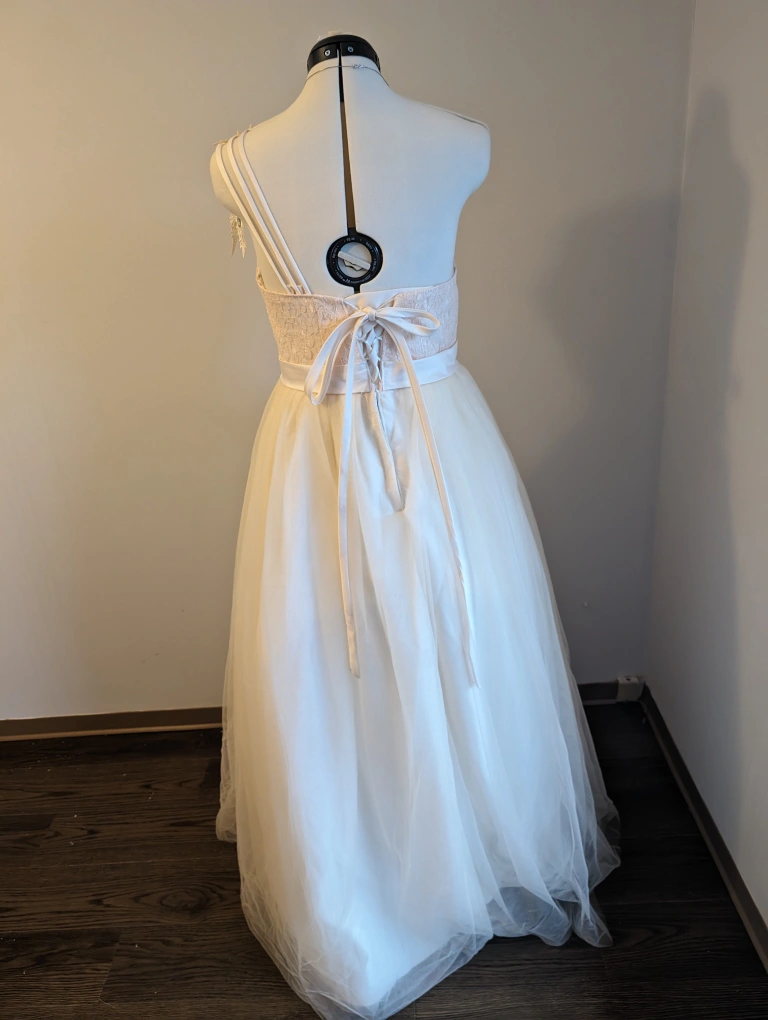 This featured dress has one shoulder and a triple spegetti strap back with eyelets and satin ribbon so it can go from a size 6 to a 10.