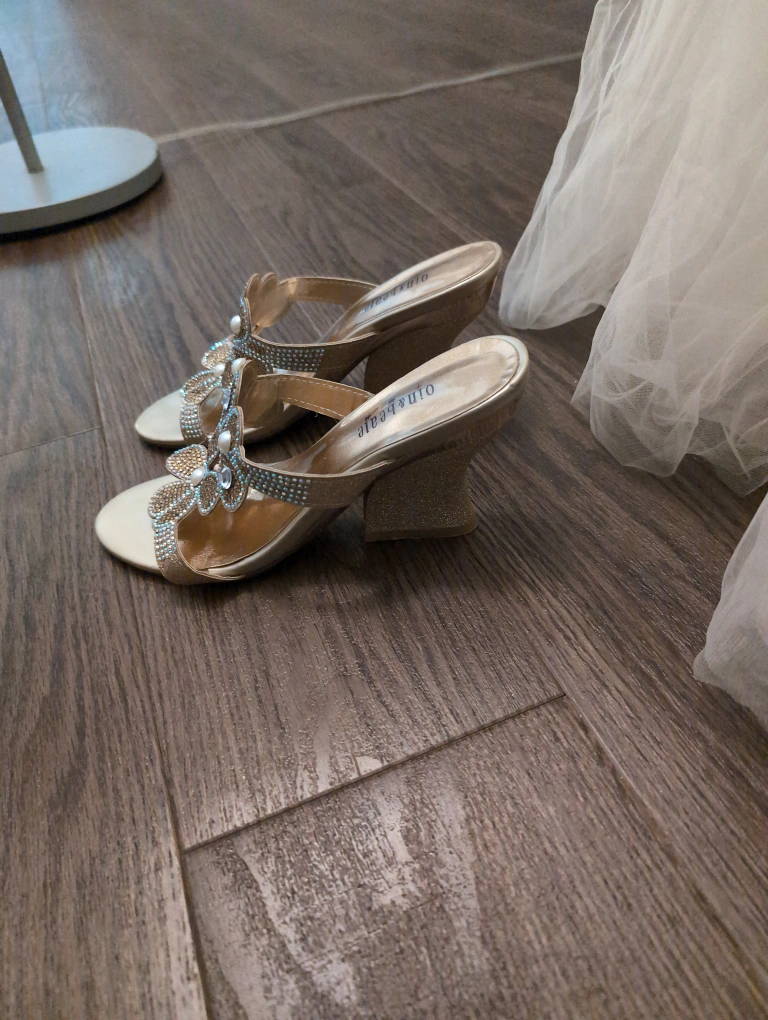The skirt is floor length and made of satin and tulle all in a soft pastel colour. The shoes are by Nima and match the elegance of the dress which is an original couture designer dress.