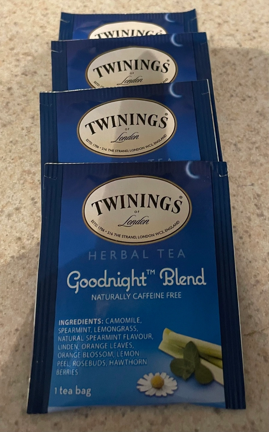 4 Good night Blend tea bags are available for free. Caffeine free, flavours in it are Linden, orange leaves, Orange Blossoms, Lemon peels.
