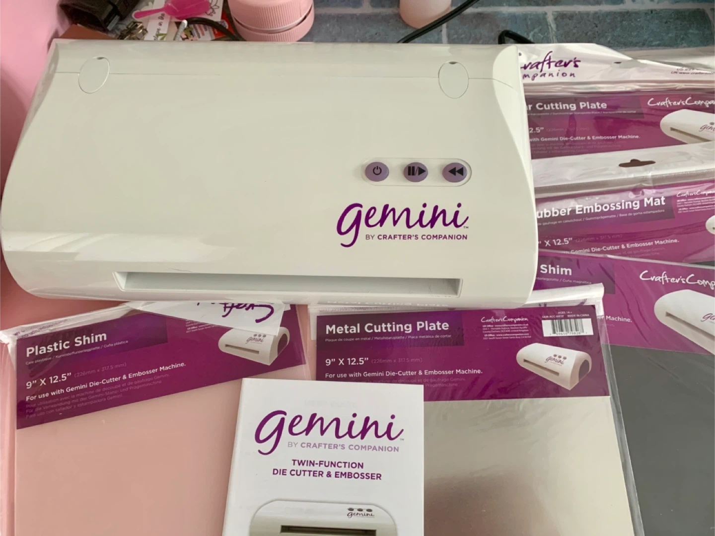 This Gemini by Crafter's Companion is a twin-function die-cutter and embosser. It comes with various plates and shims for crafting projects. It's a great tool for card making and scrapbooking!