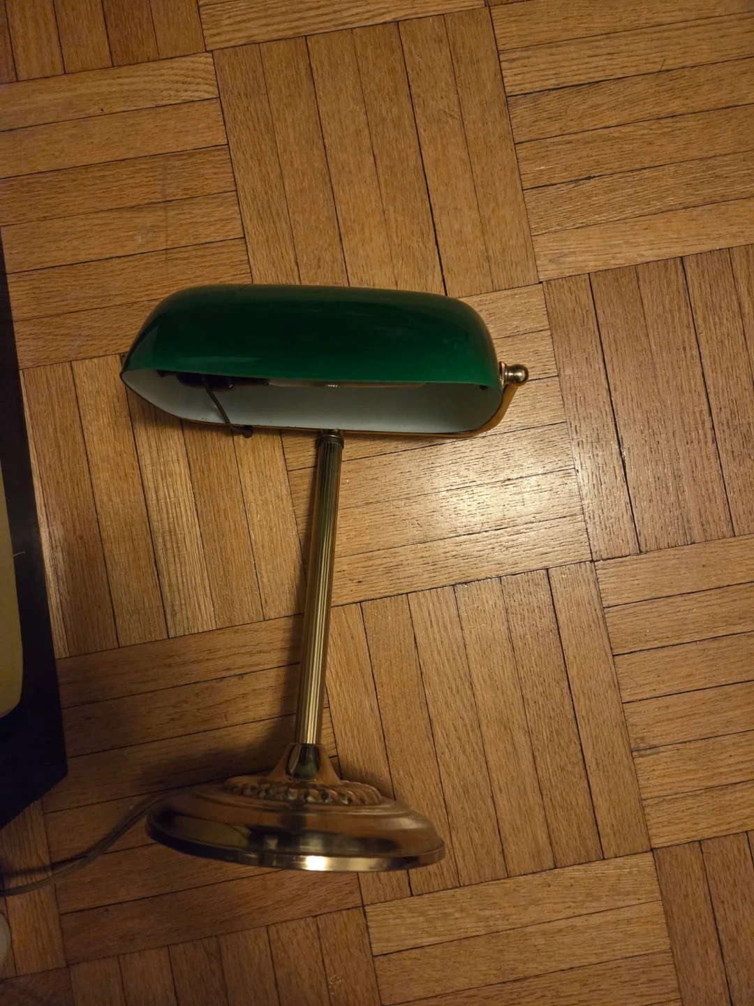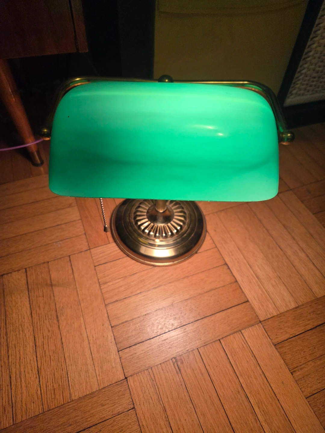 This classic vintage banker's lamp features a green glass shade and a brass-finished base. It's perfect for adding a touch of vintage style to your desk or workspace. The pull chain allows for easy on and off and works perfectly.