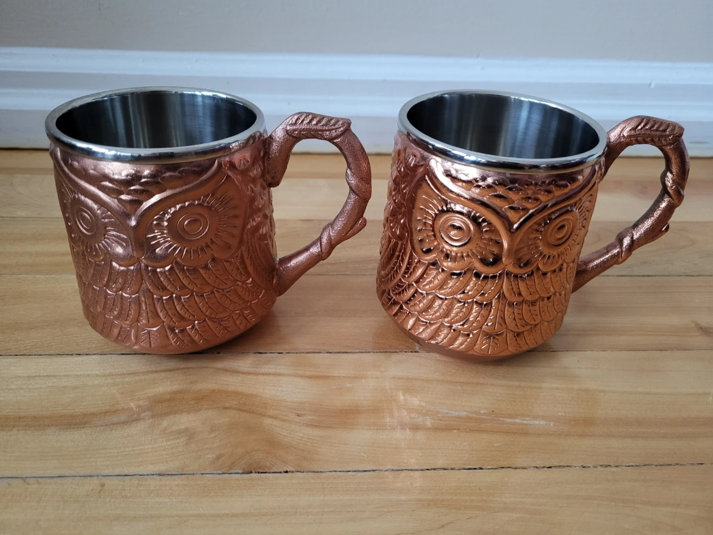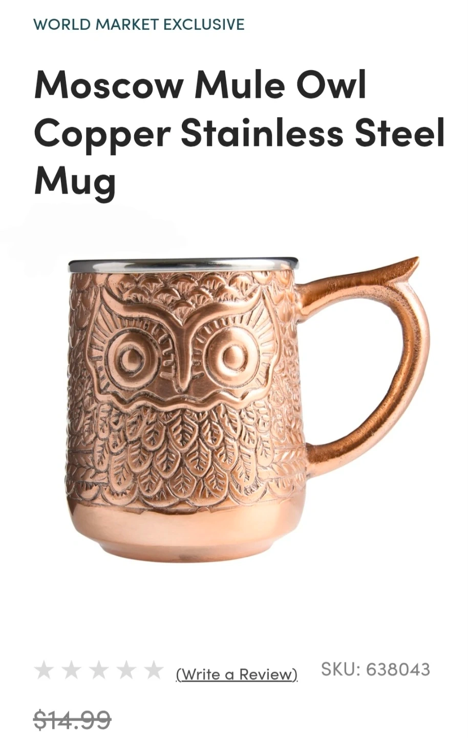 A whimsical addition to your bar cart, our exclusive owl Moscow mule mug is made in India with intricate embossing. Crafted of stainless steel with a luminous copper finish on the exterior, our woodland-inspired cocktail cup keeps your ginger beer cold. This large-eyed feathered friend makes a delightful vessel for any refreshing drink or a fabulous gift for an aspiring mixologist.