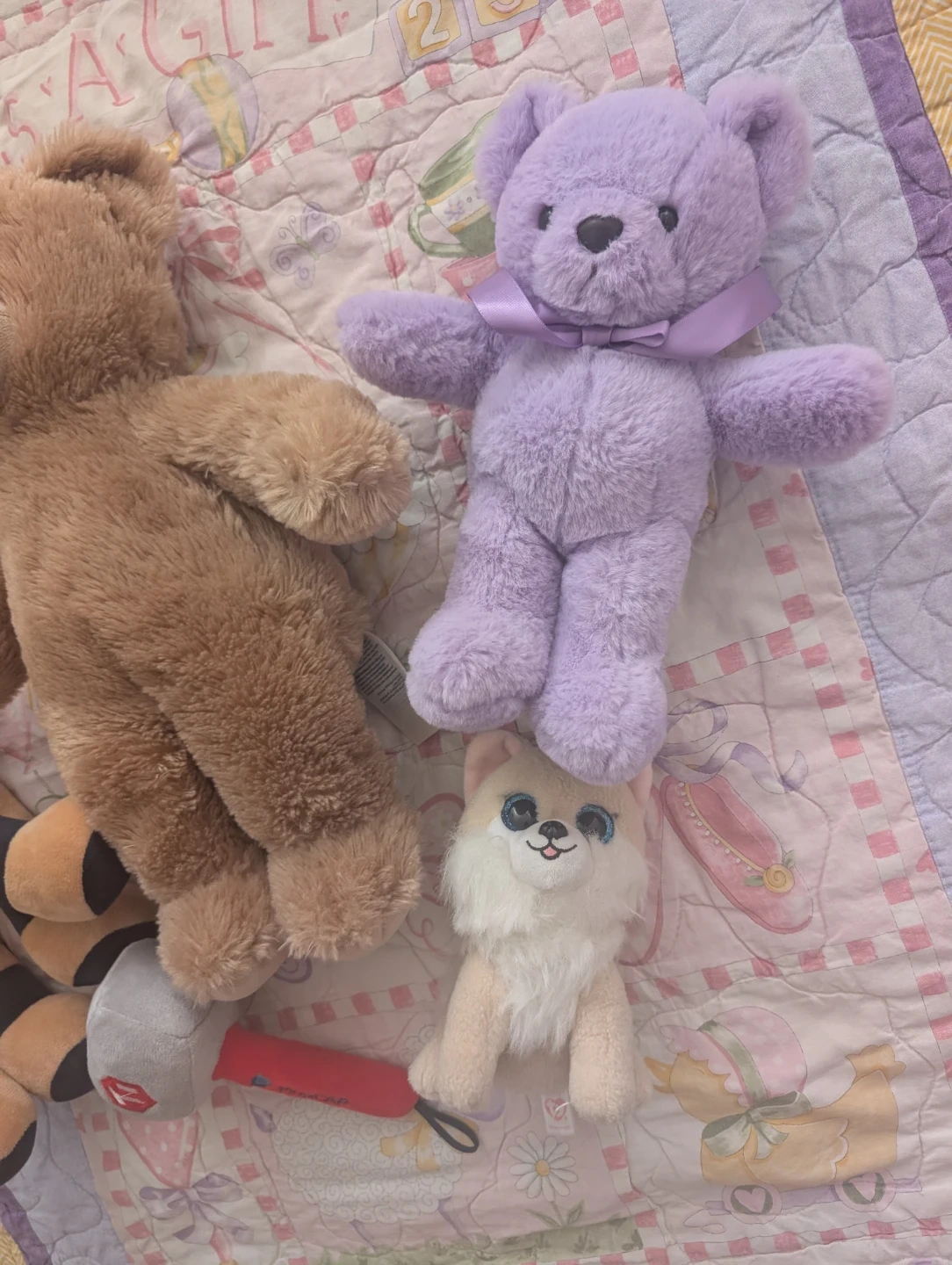 This bundle includes a brown teddy bear, a purple teddy bear with a ribbon, a camel plush, and a small white and pink dog plush. There's also a small grey and red plush mic.