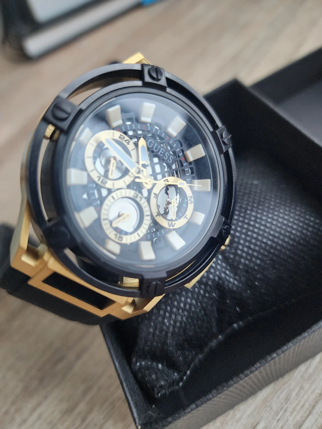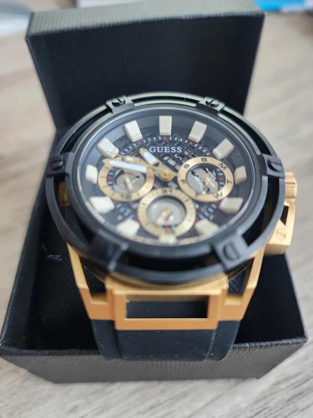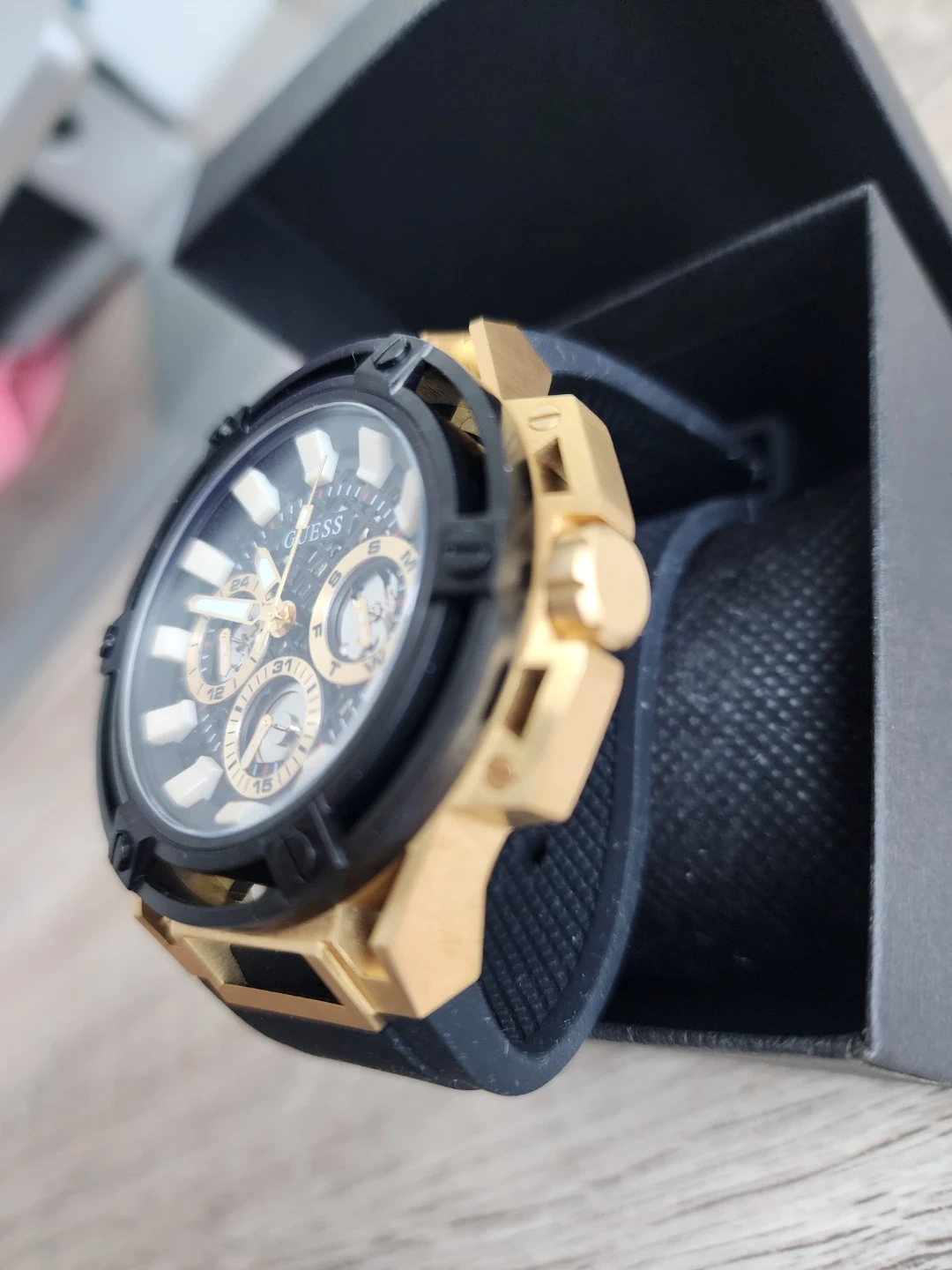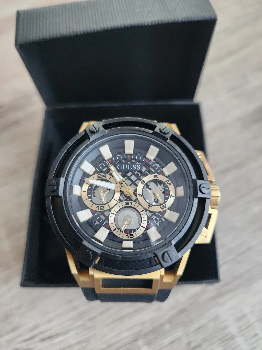 This is a Guess chronograph watch with a gold and black design. It includes an original box. It's a stylish accessory for everyday wear.