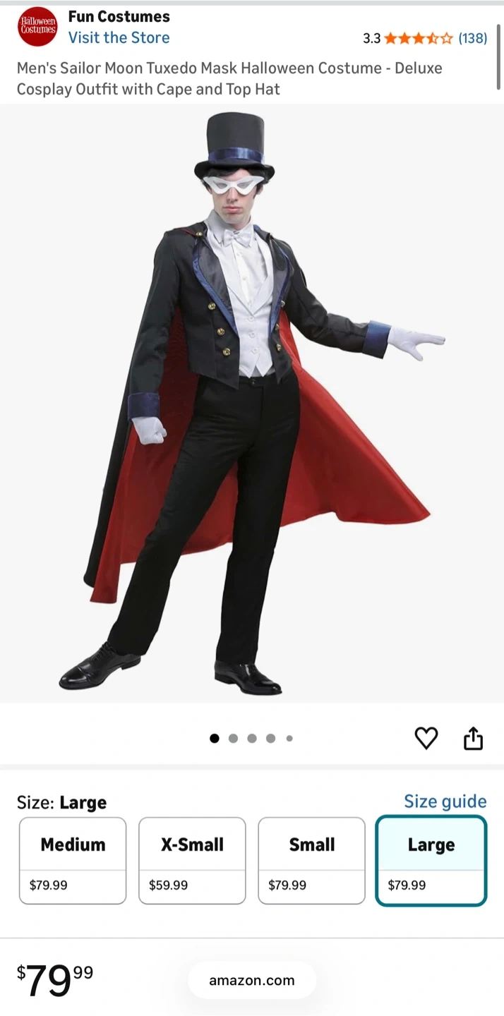 This is a deluxe men's Tuxedo Mask cosplay outfit. It includes a cape and top hat. Available in large size.