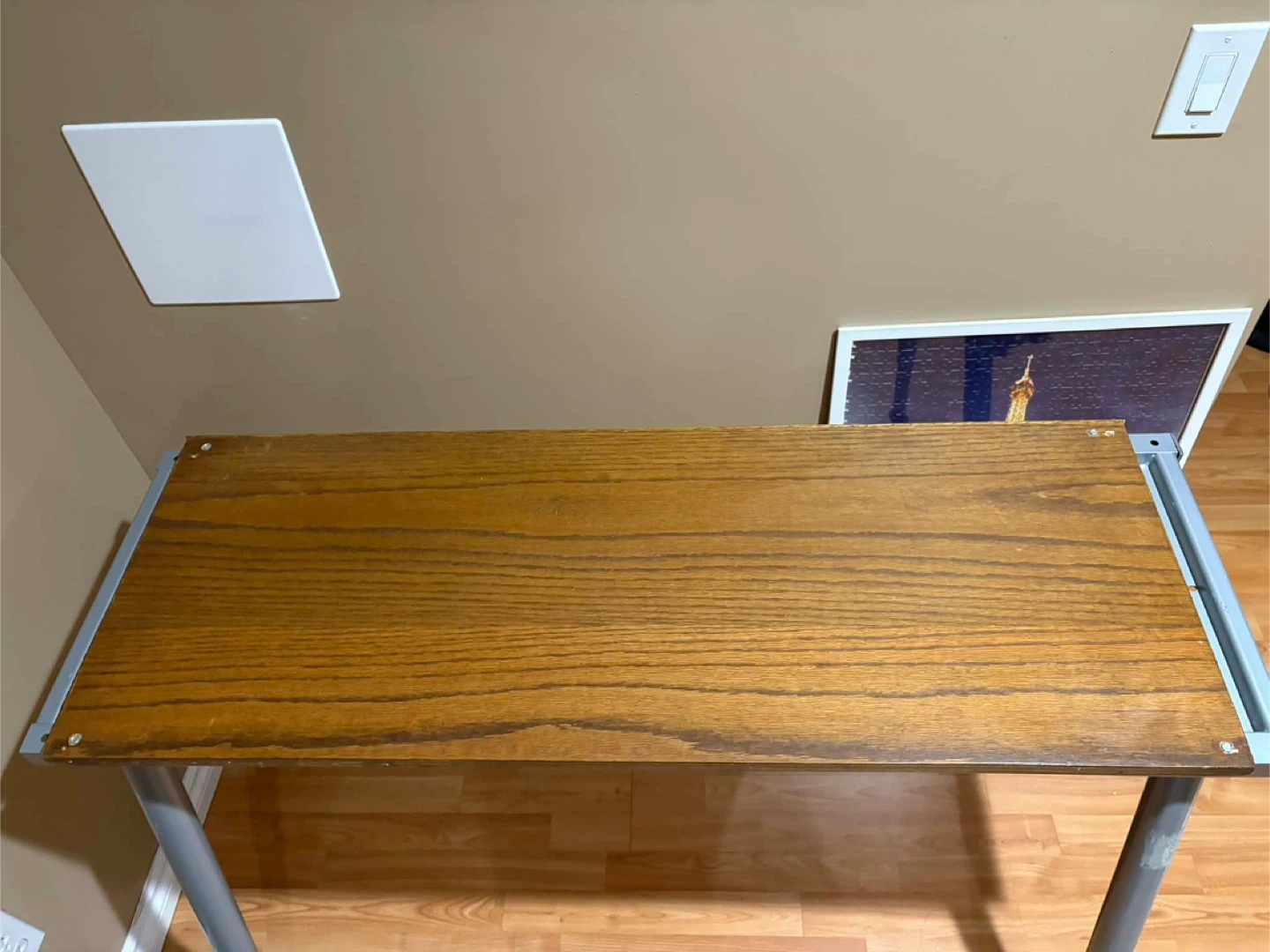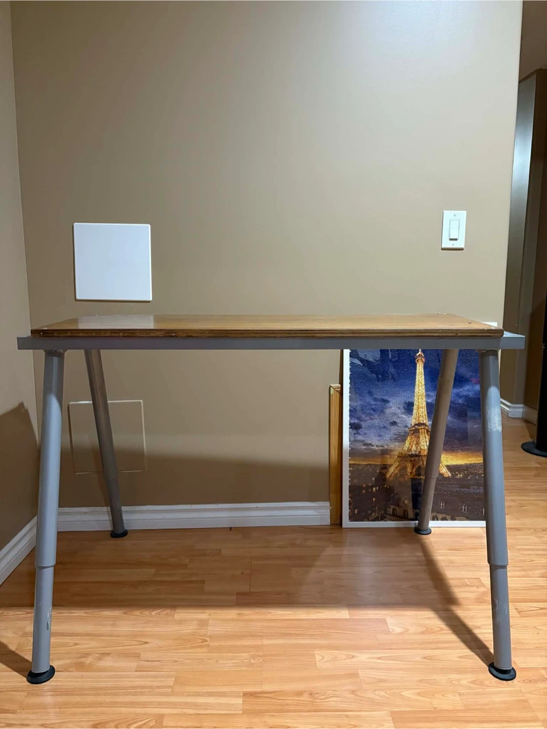 This desk has a wood-look laminate top and metal legs. It's a great size for a home office or study space. The legs are adjustable.