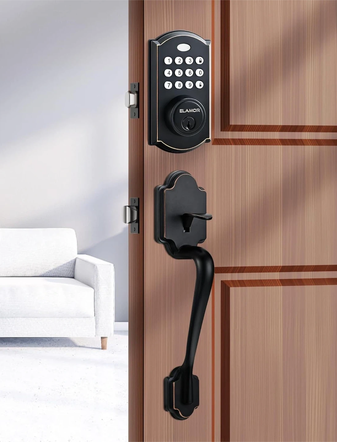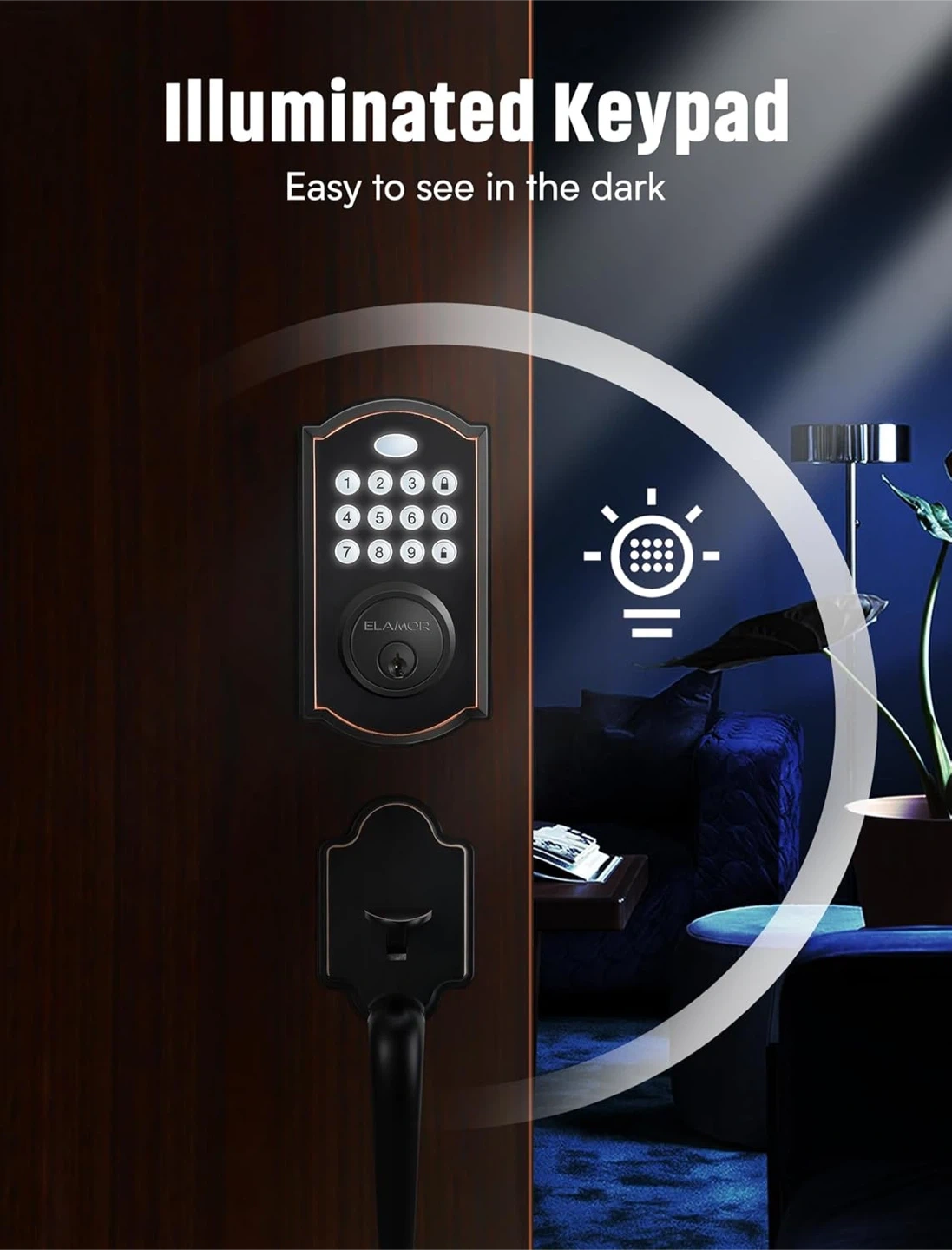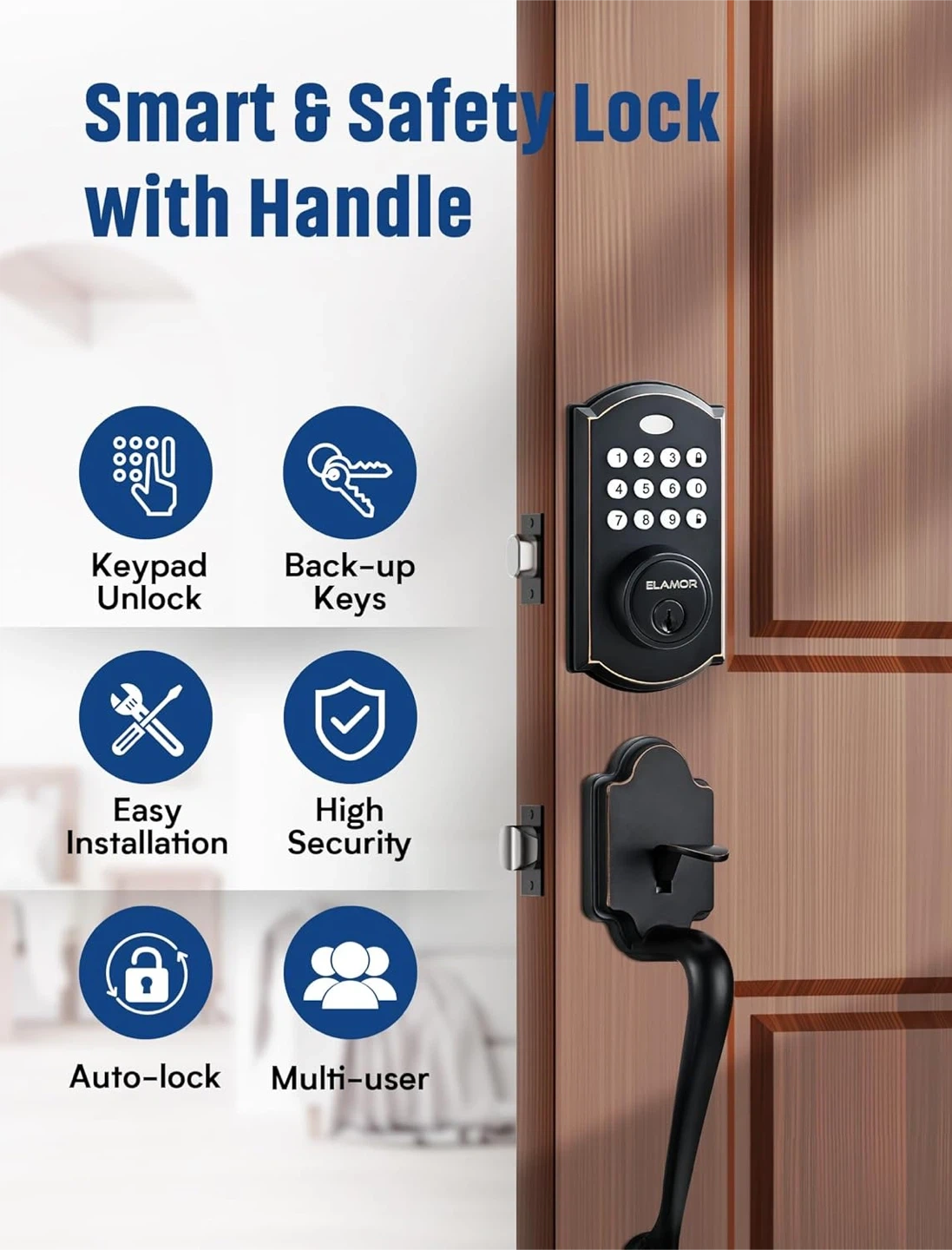 This Elamor keypad deadbolt with handle offers smart and safety lock features. It includes a keypad unlock, back-up keys, easy installation, high security, auto-lock, and multi-user access. The keypad is illuminated for easy visibility in the dark.