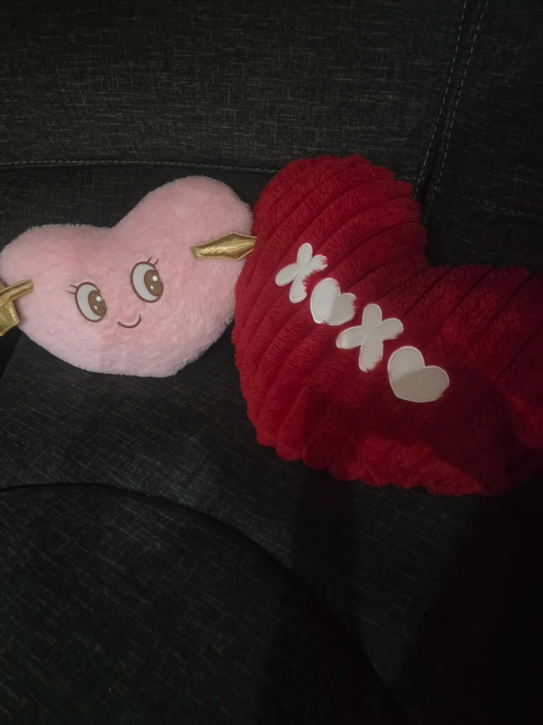 Two soft plush heart-shaped pillows. One is pink with a cute face and golden arrow accents. The other is red with "XOXO" stitching. They're great for decor or cuddles!
