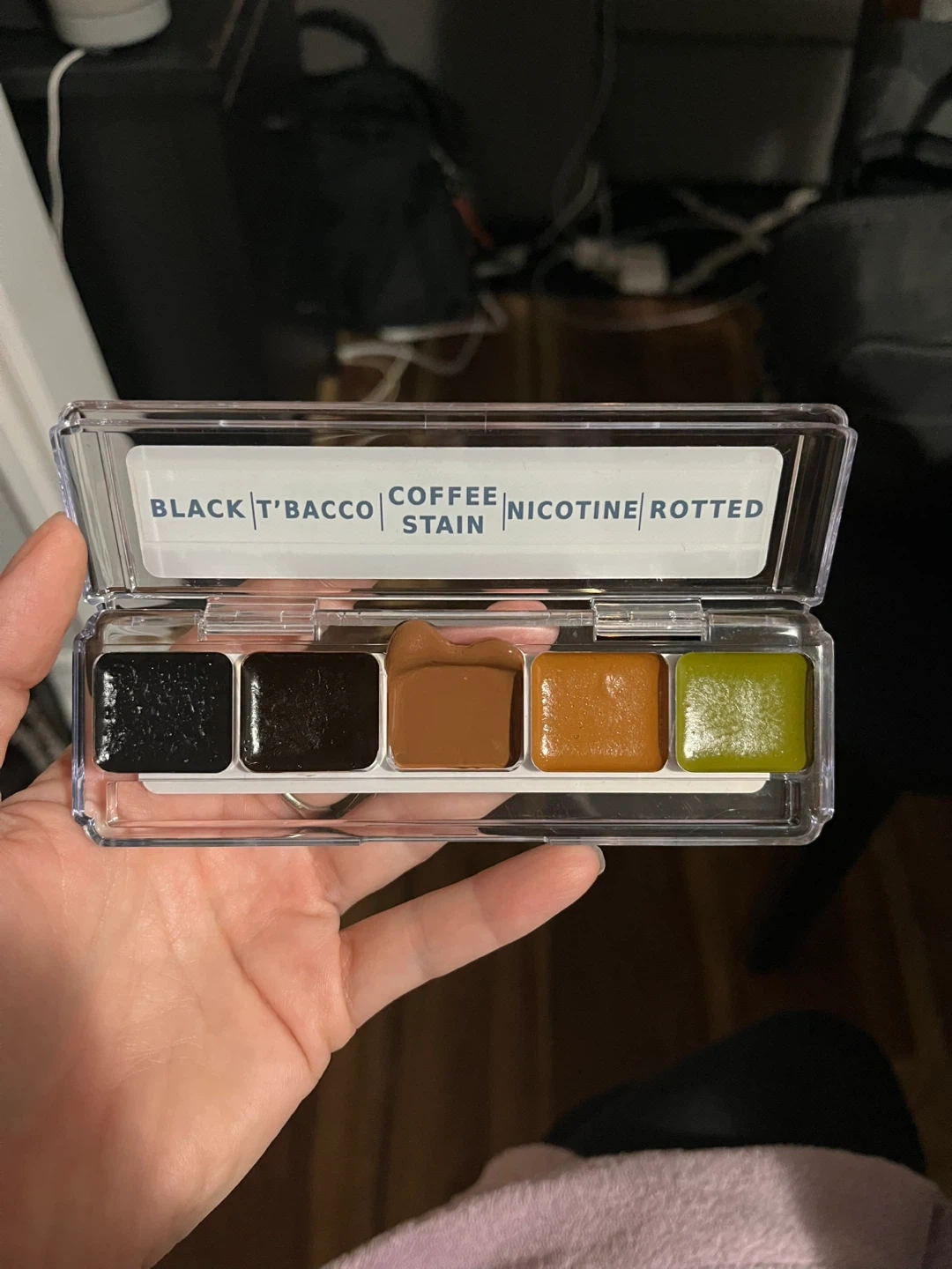 This is the Fleet St. Pegworks Alcohol Activated Tooth Lacquer Palette 1. It includes five shades: Black, T'bacco, Coffee, Nicotine, and Rotted for Special Effects