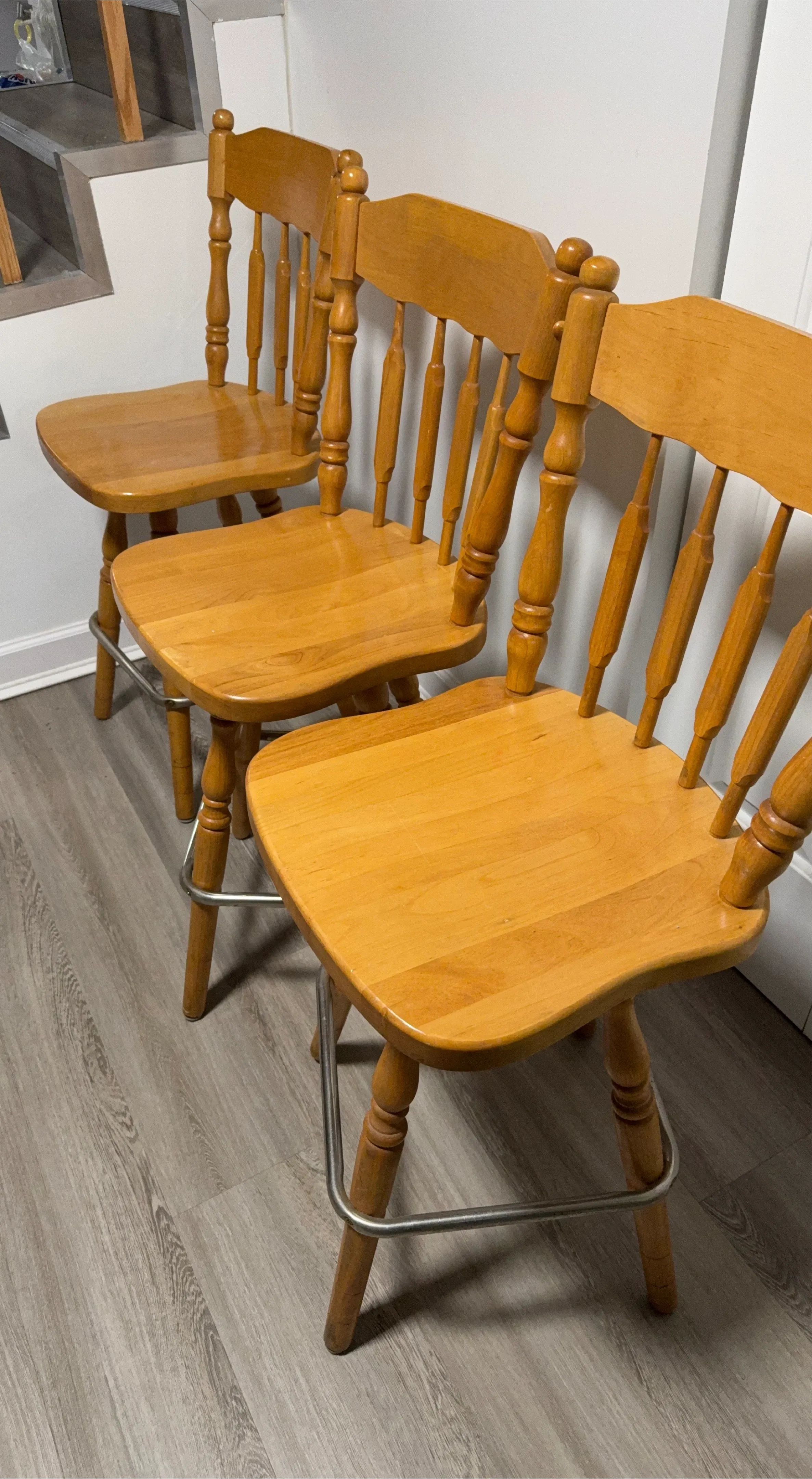 Three wooden bar stools with a natural wood finish and silver footrests. They have spindle backrests for a classic look. Perfect for a kitchen island or home bar setup!