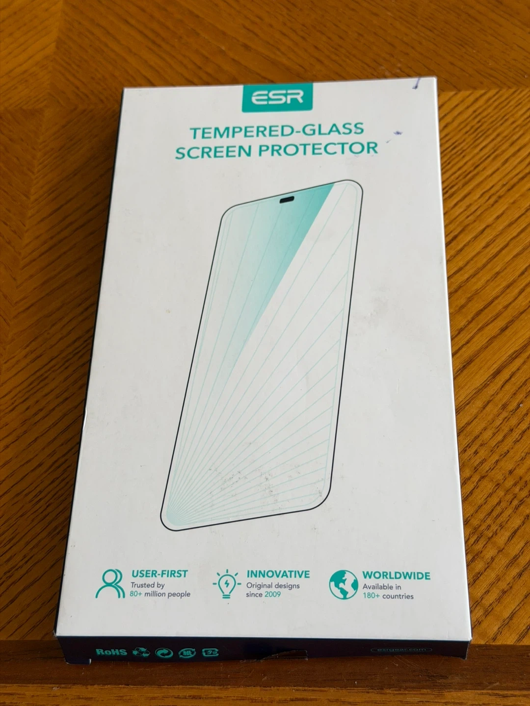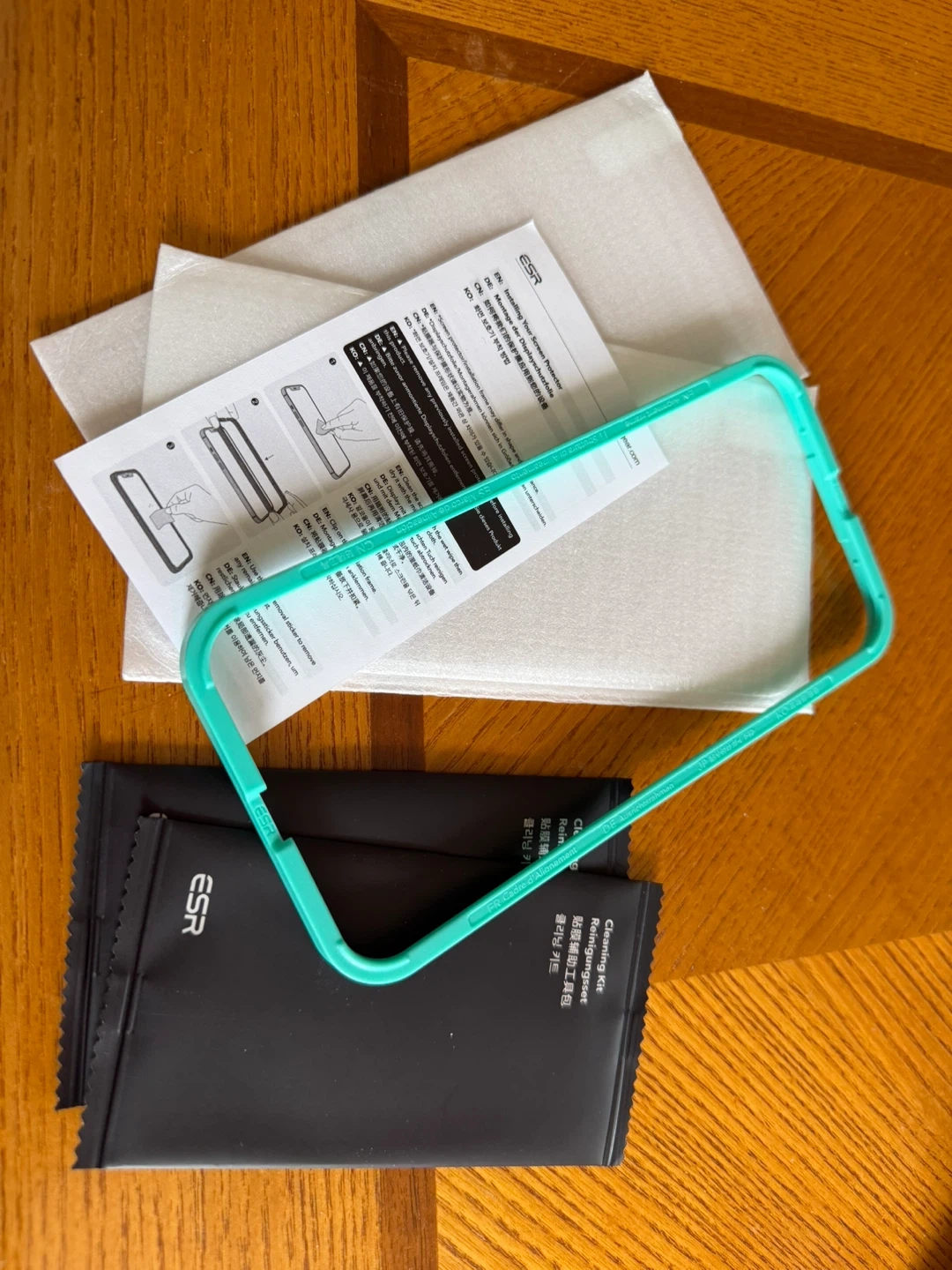 This is an ESR tempered-glass screen protector for a phone. It includes a cyan installation frame and a cleaning kit. This protector offers a clear display and protects your screen from scratches.