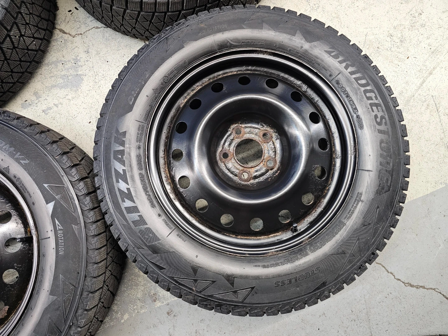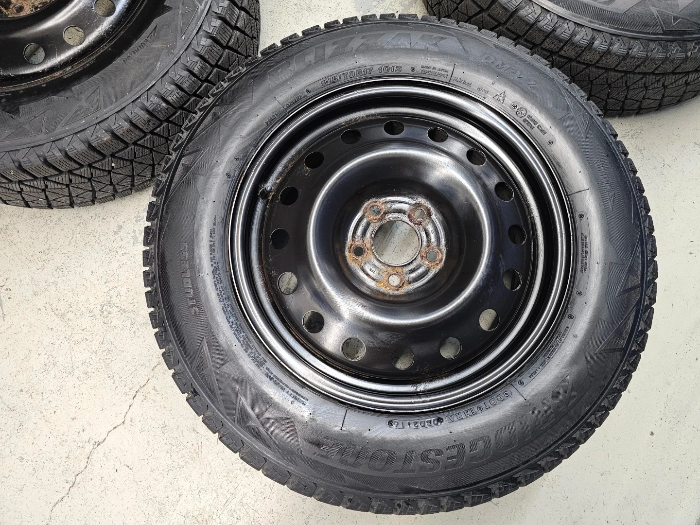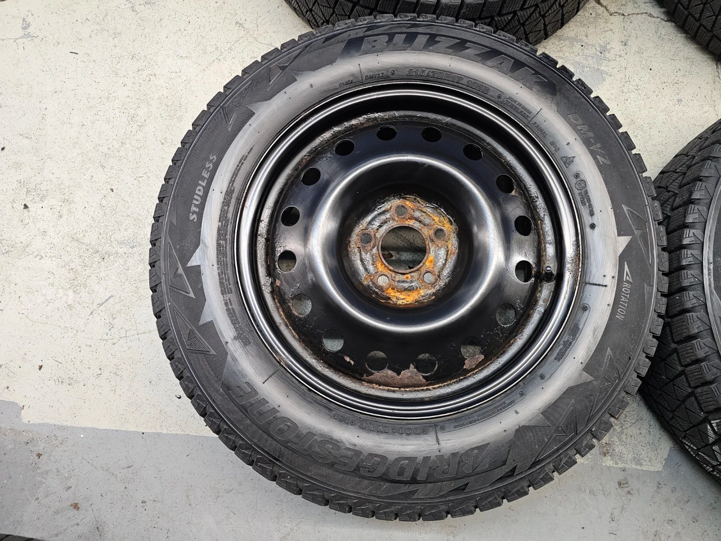 Set of 4 17" Bridgestone blizzak winter tires on steel rims used on Mazda cx-5 215/70 R17. Rims and tires are in good shape with lots of thread left on tires, no cracks, no damage