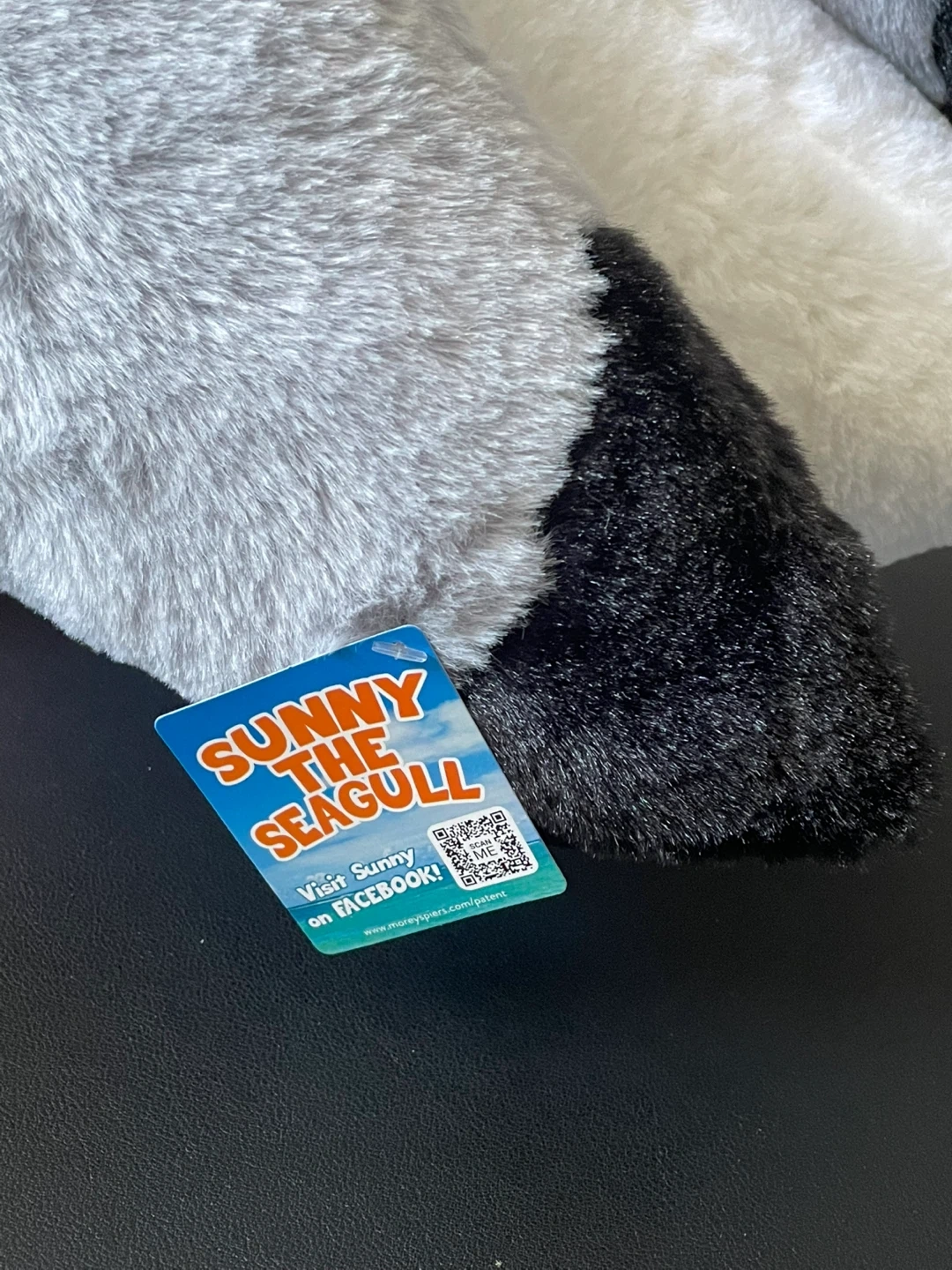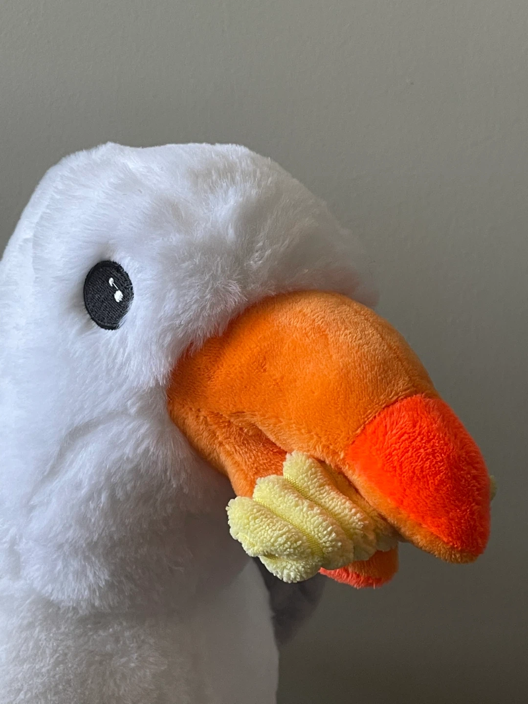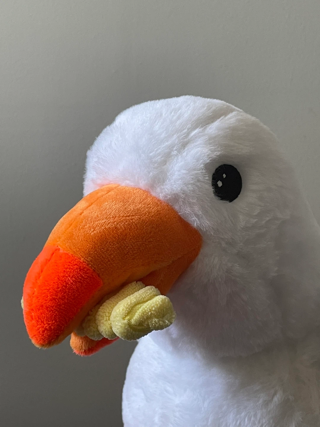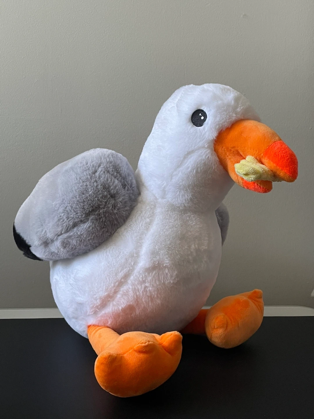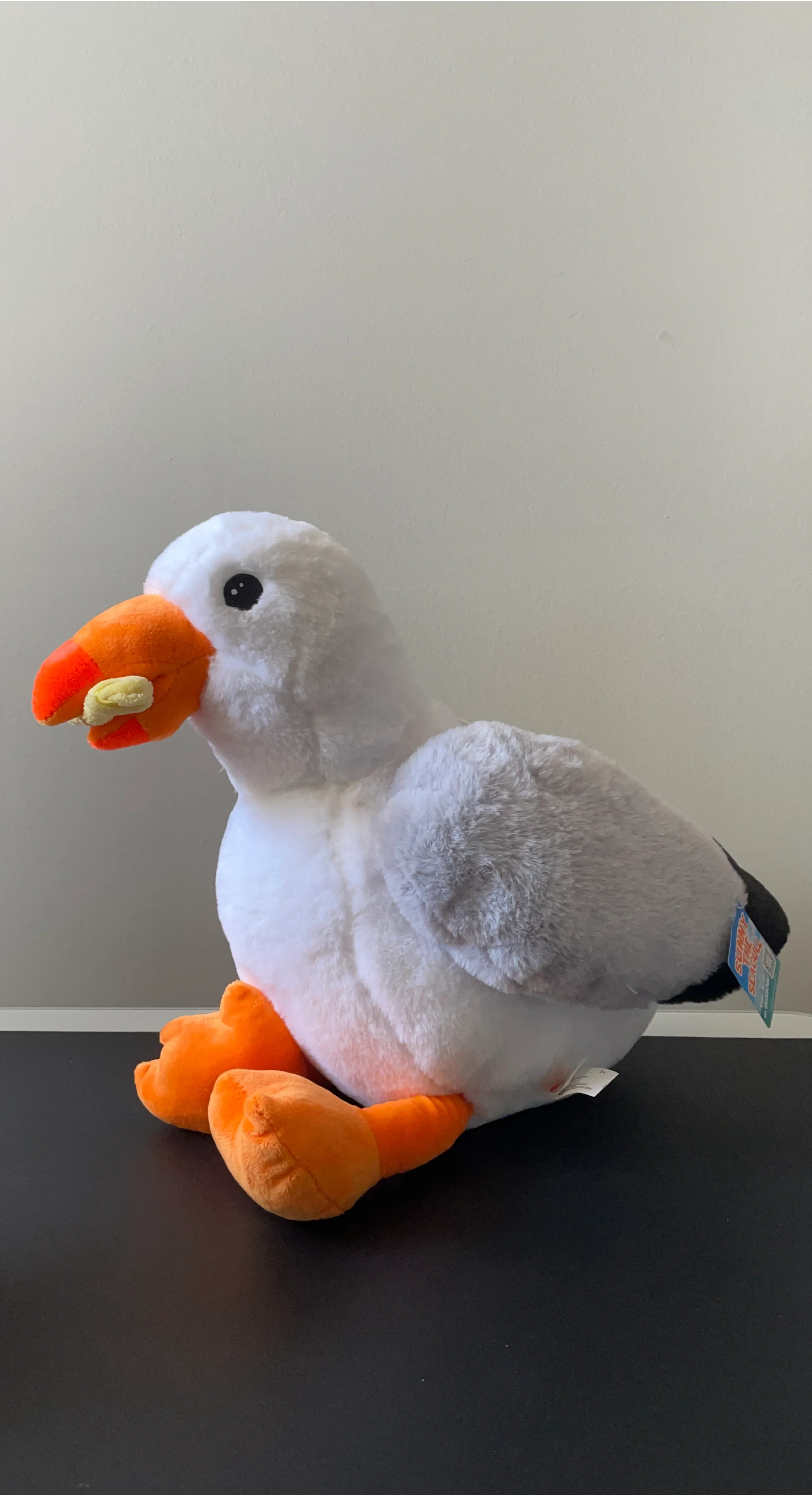 NEW with tags. Fluffy Seagull Plush holding a French Fry. It's white with grey wings, orange feet and beak with signature French fry in its mouth. Perfect for bird lovers and cuddling!