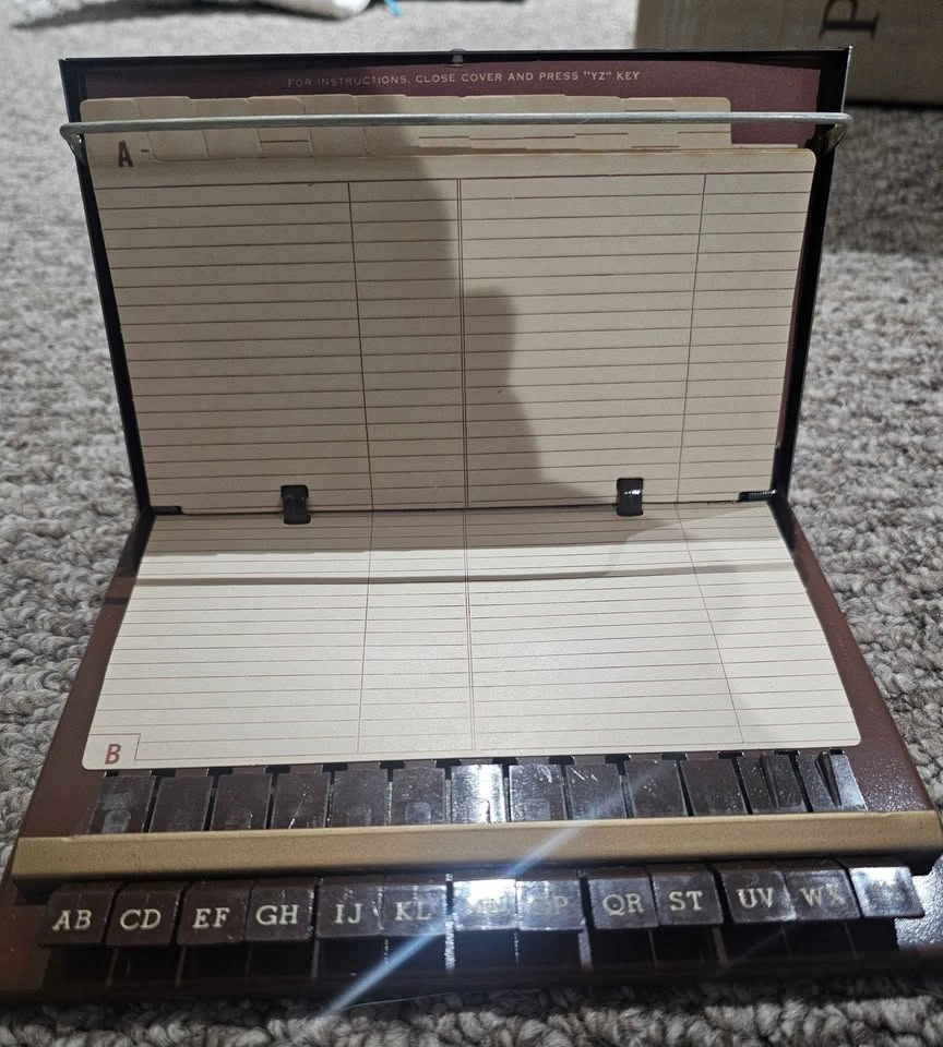 Retro Zephyr Autodex! This is a cool vintage desktop address book or phone number organizer. Has alphabetical keys so you can quickly find numbers. Comes with blank cards inside for all your contacts and some pre-printed emergency numbers too. Never been used!