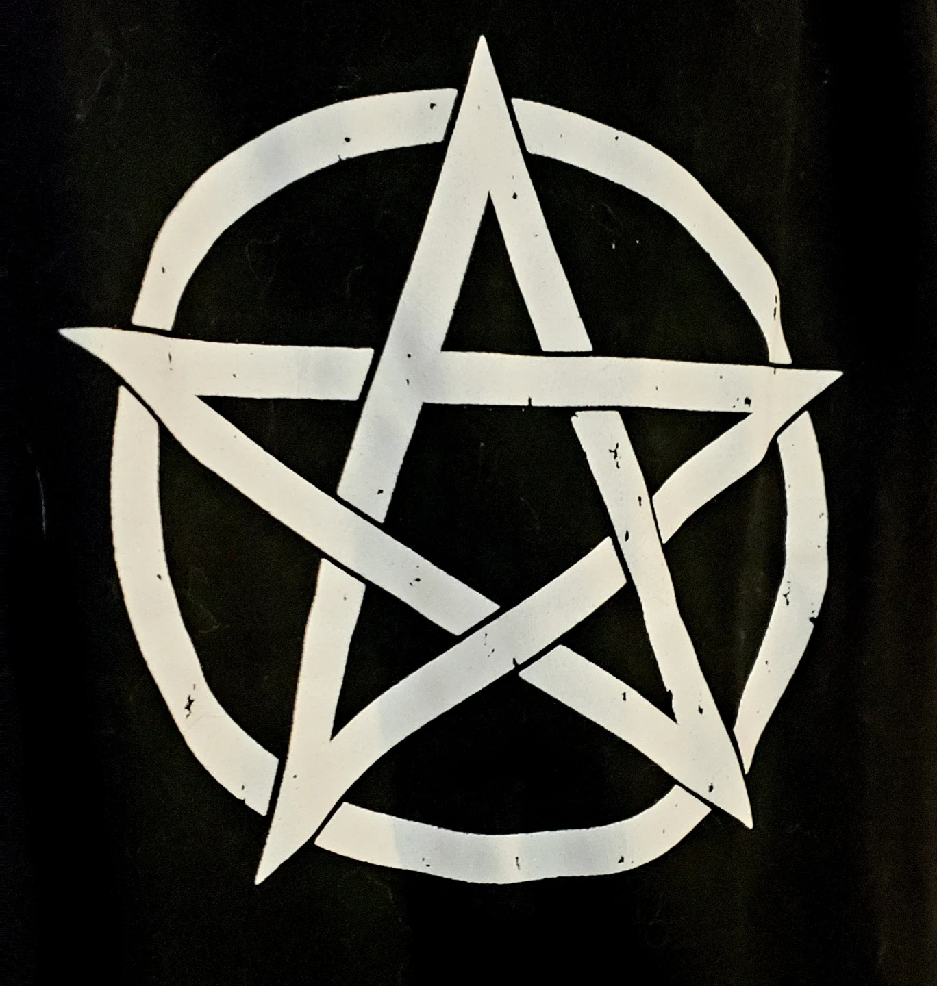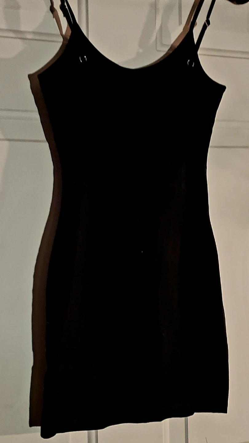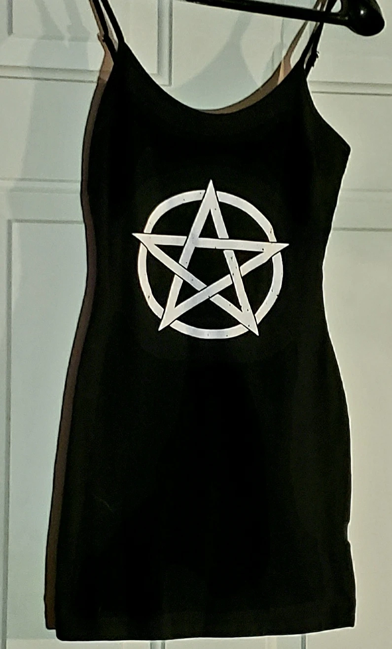 Black dress featuring a white pentagram graphic on the front. It has thin spaghetti straps. This dress is a size medium and fits like a glove. Super comfy