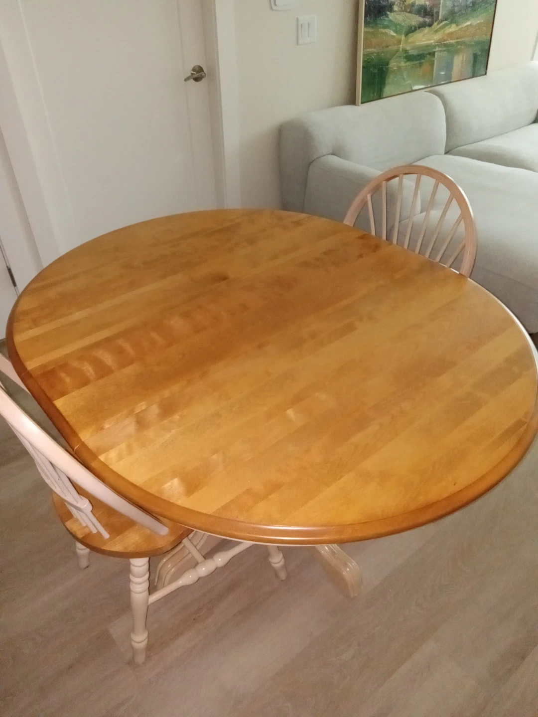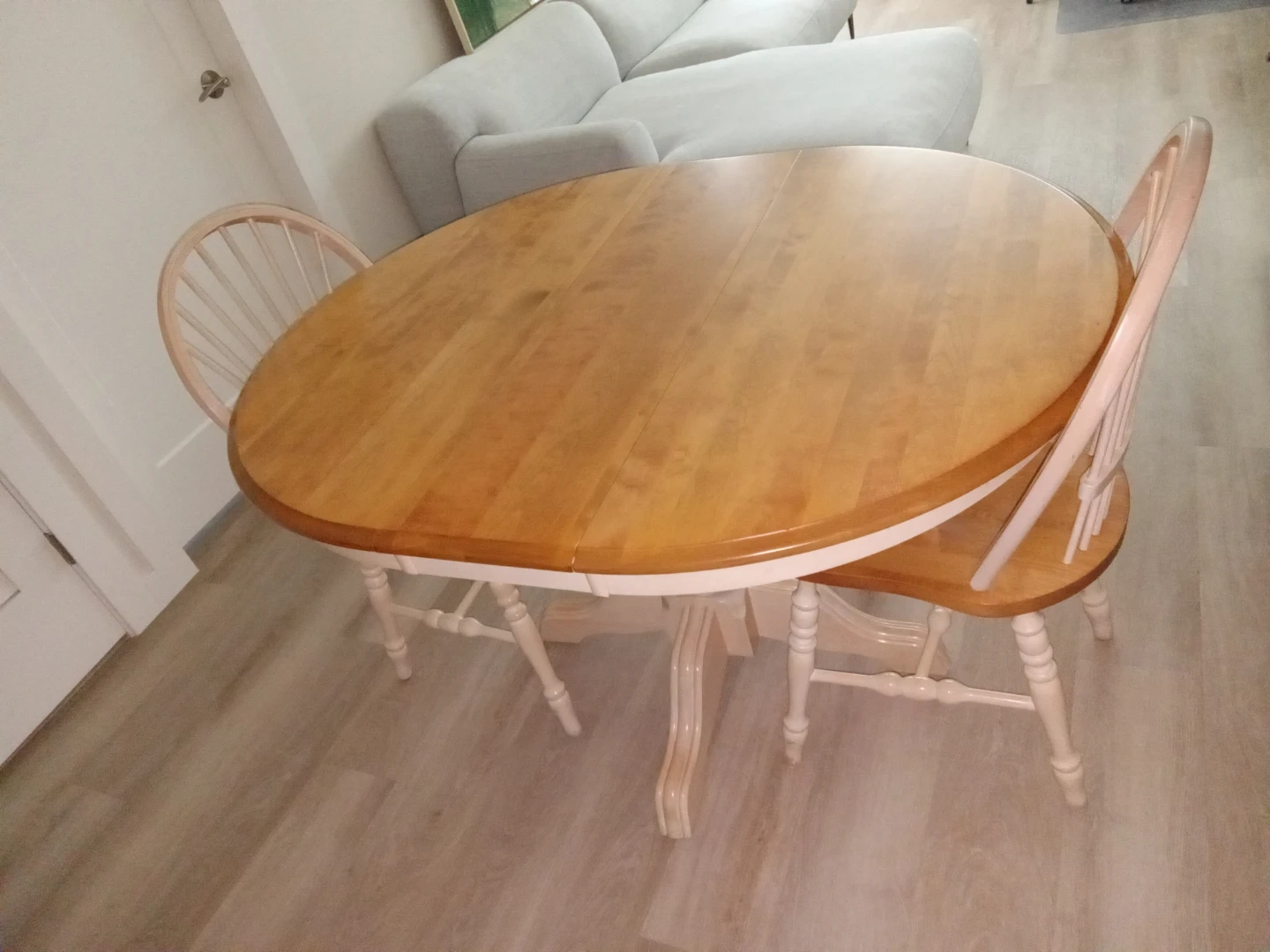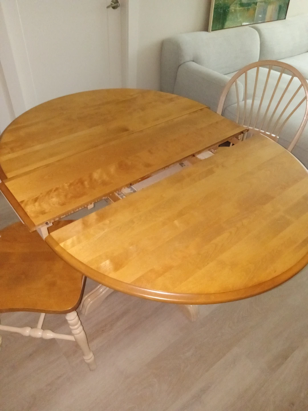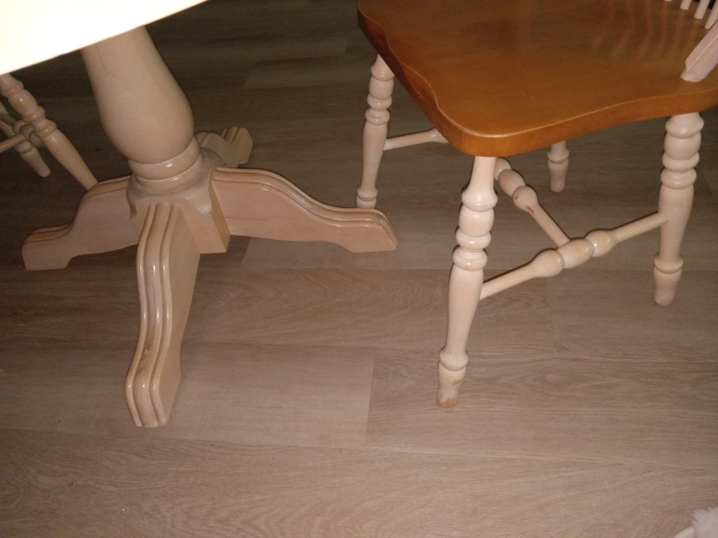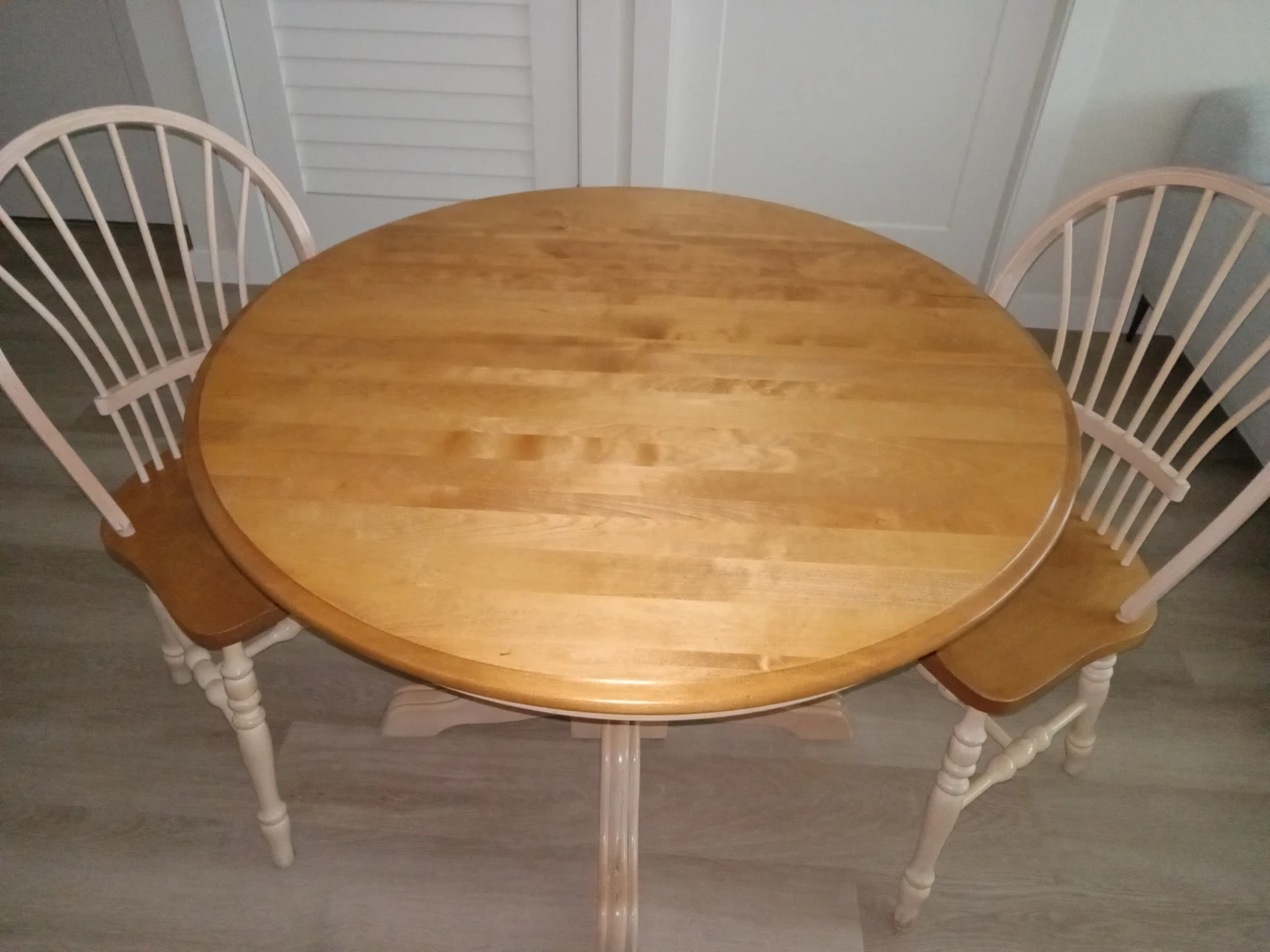 A lovely wooden dining set with an expandable tabletop, with 2 unstable extentions for 3 table-sizes in total. The table features a pedestal base and comes with 6 matching chairs. This set is perfect for smaller dining areas or kitchens!