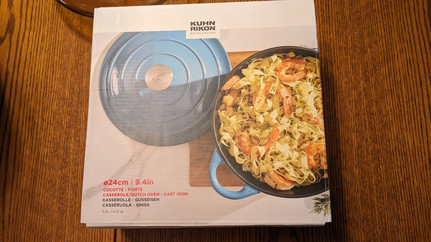 Selling a Kuhn Rikon Dutch oven, brand new in box! It's 24cm / 9.4 inches in diameter and has a 3.9L / 4.12 qt capacity. Perfect for making casseroles or stews!