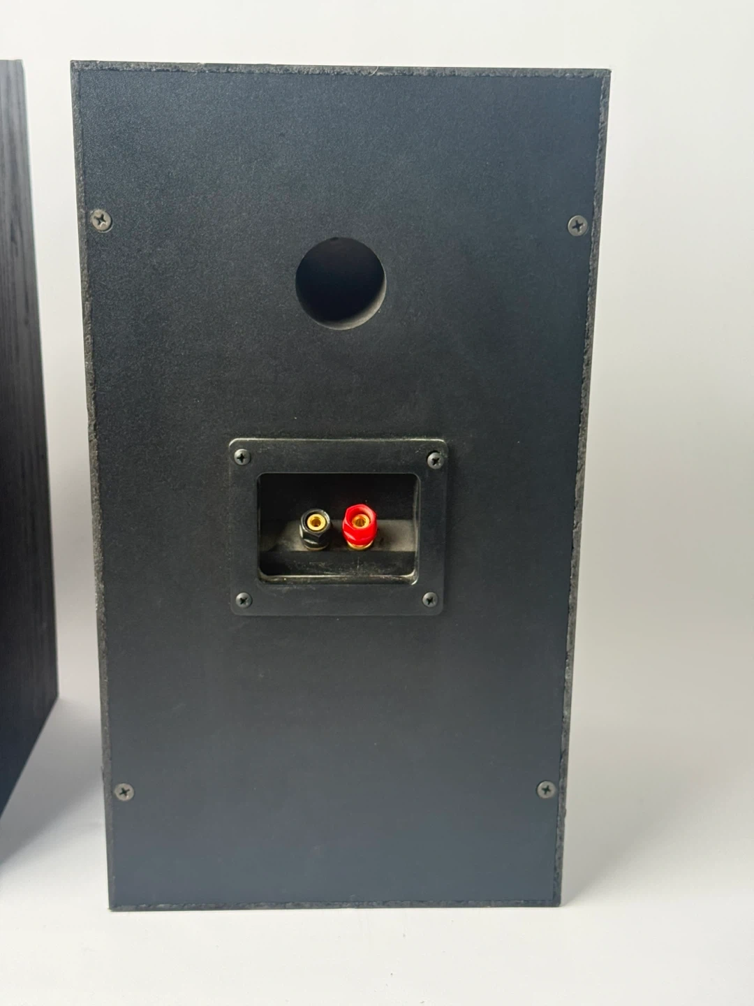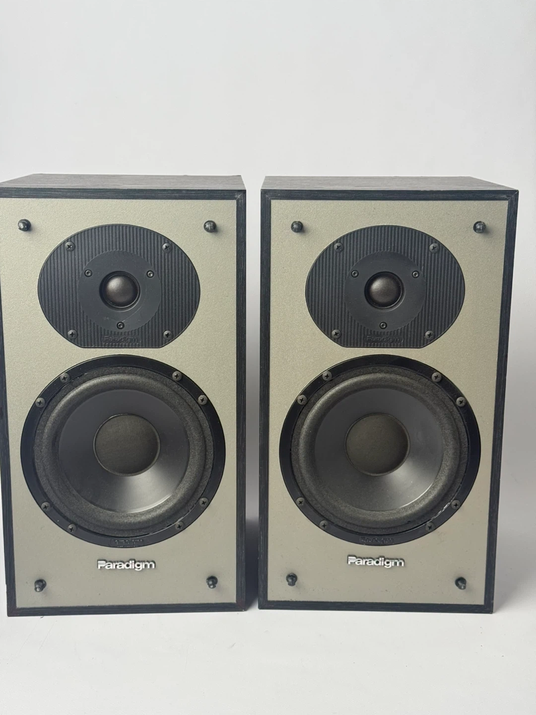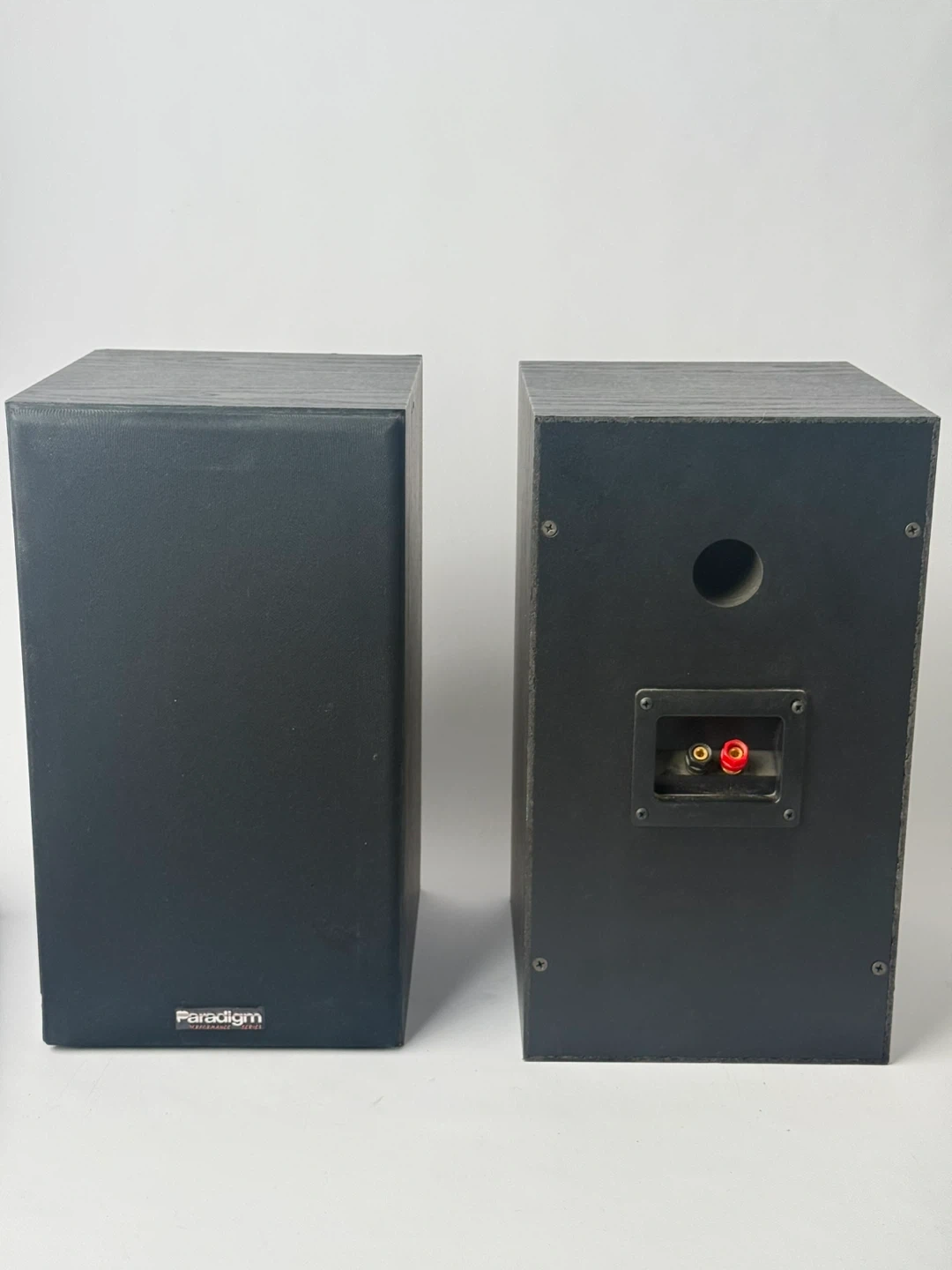 A pair of Paradigm bookshelf speakers in black. These compact speakers are great for stereo listening or as part of a home theatre setup. They feature binding post terminals for easy connection.