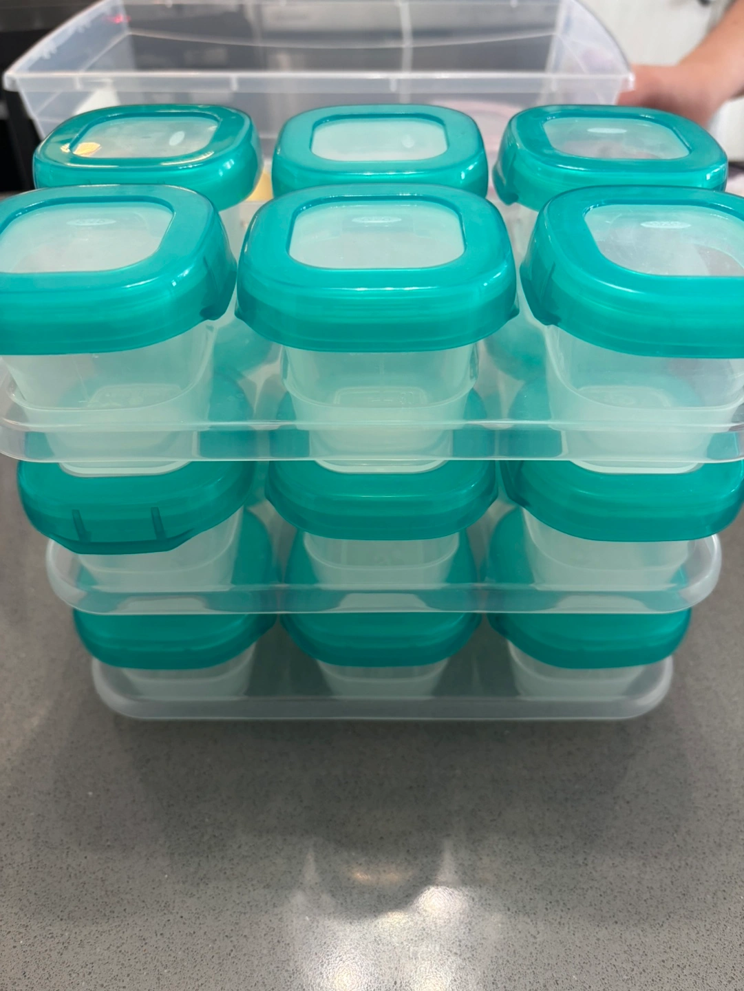 76Stackable containers, teal lids, clear base. Great for freezing and storing baby food. They are $19.99 in amazon with tax for 6 containers