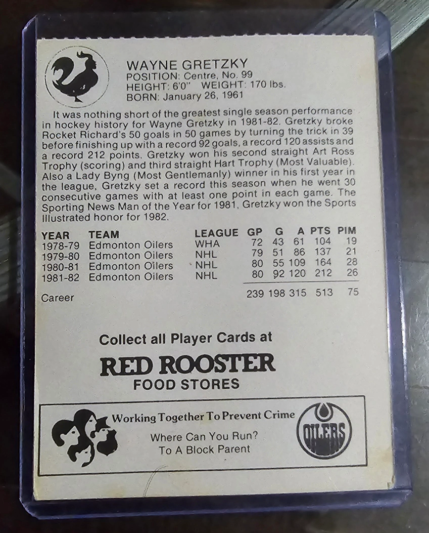 During a 4-year run in the 1980's, Red Rooster, a chain of Canadian convenience stores, created a yearly Edmonton Oilers promotional team set of hockey cards in order to give to customers. These are from run in 82/83.