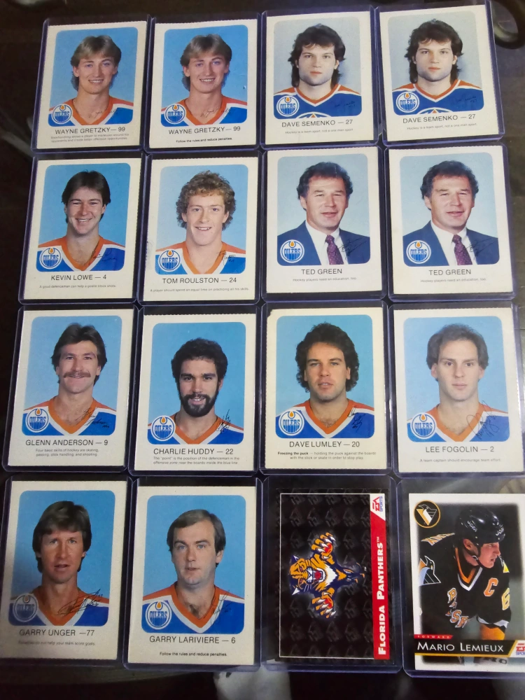 Set of rare Edmonton Oilers promotional hockey cards from 1982-1983 including 2 Gretzky's. Also a Mario Lemieux and Florida Panthers card from EA Sports in 1994.