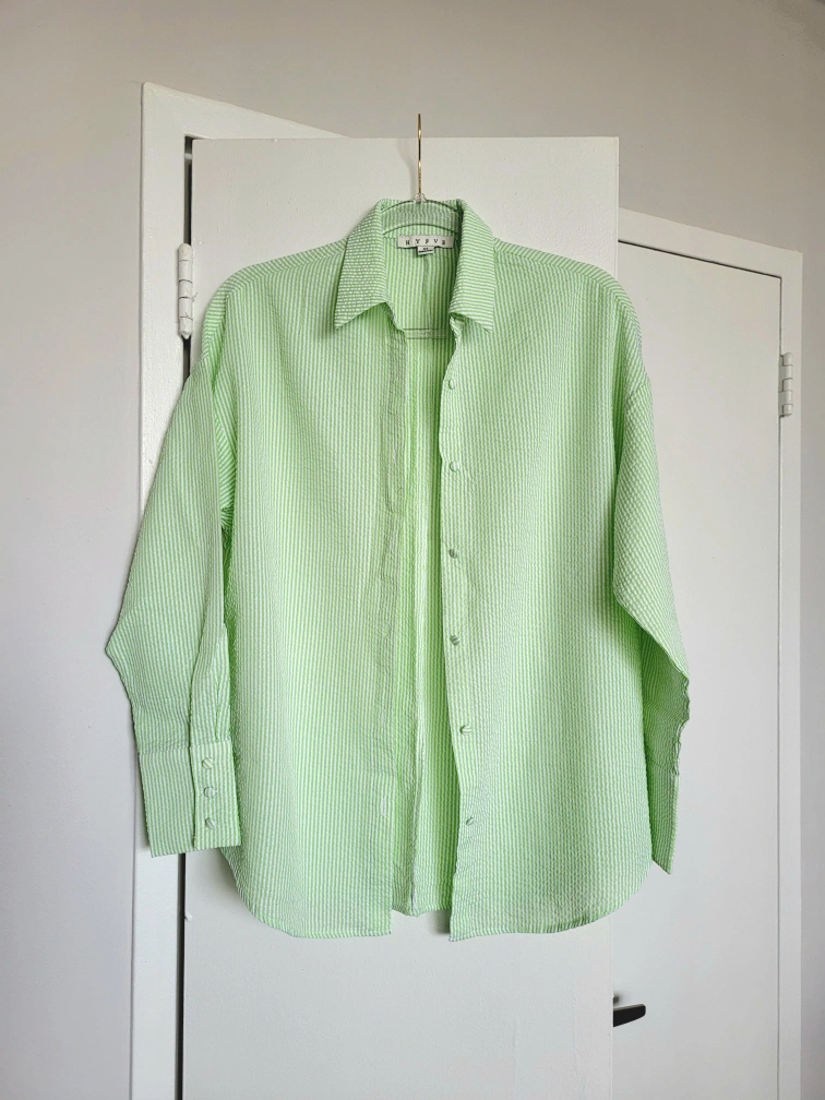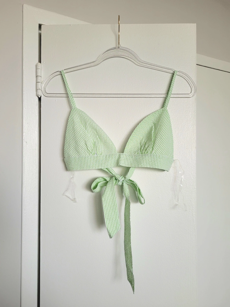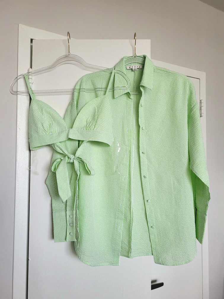 Green and white striped button up with matching bralette. Perfect for upcoming summer!