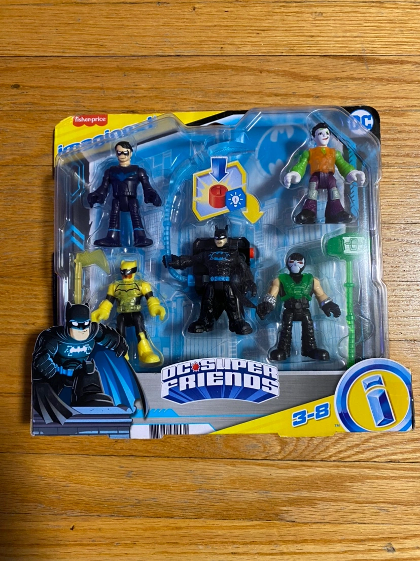 The battle for Gotham City gets lit with the Imaginext DC Super Friends Bat-Tech Multi-Pack from Fisher-Price. This action-Packed figure set features 5 poseable Super Hero and Super-Villain figures, each with a unique clear chest. Kids can attach the light-up backpack to a figure and one of the 3 accessories then press the button to see everything light up with awesome glowing power! Use the backpack with any Imaginext DC Super Friends figure with a clear chest to see it light up! (Additional figures sold separately and subject to availability.)