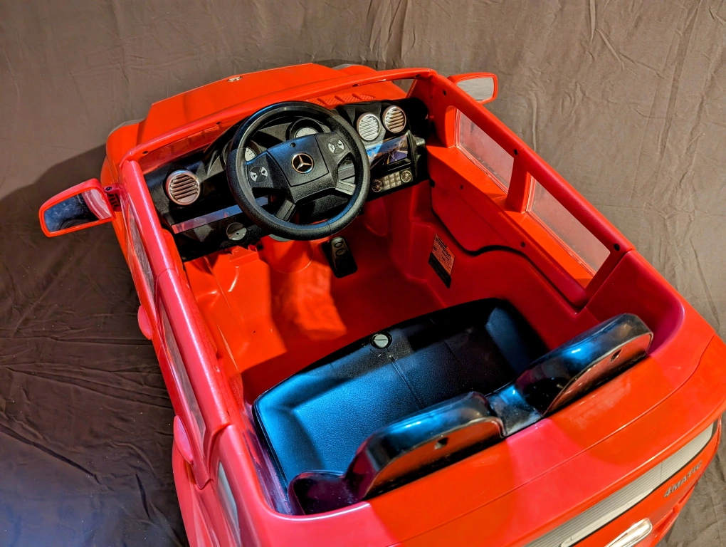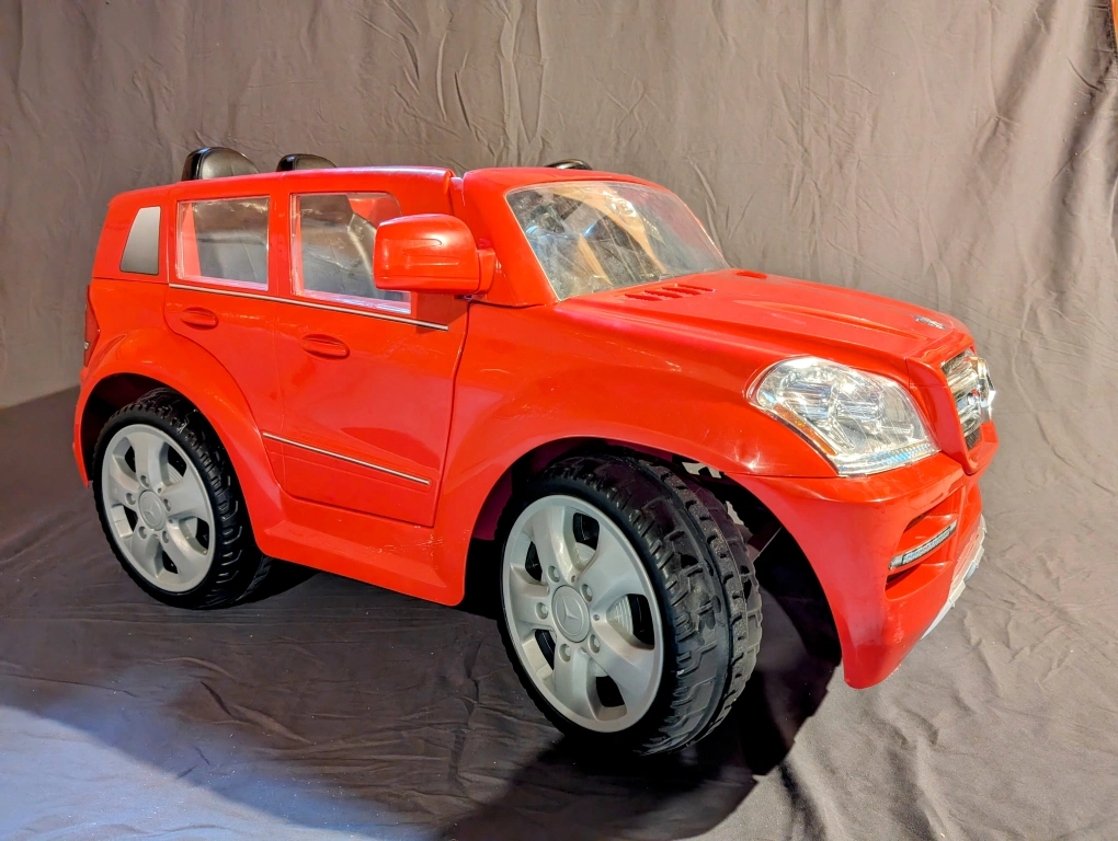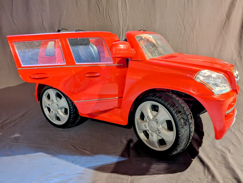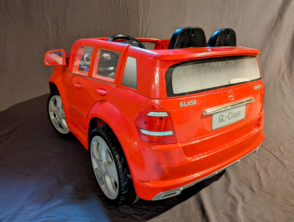 Used Roleplay 6V Mercedes GL 450 battery-powered ride-on in red. Up to 4 km/h forward or reverse, controlled by a gearshift in the center console. Features button-activated horn and engine sounds and two opening doors.