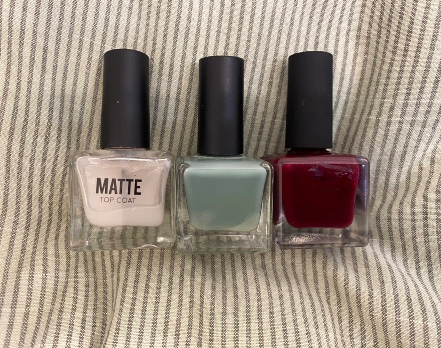 Retails for 6$ each. From left to right: Matte top coat, light turquoise, dark red. Swipe for a closer look!
