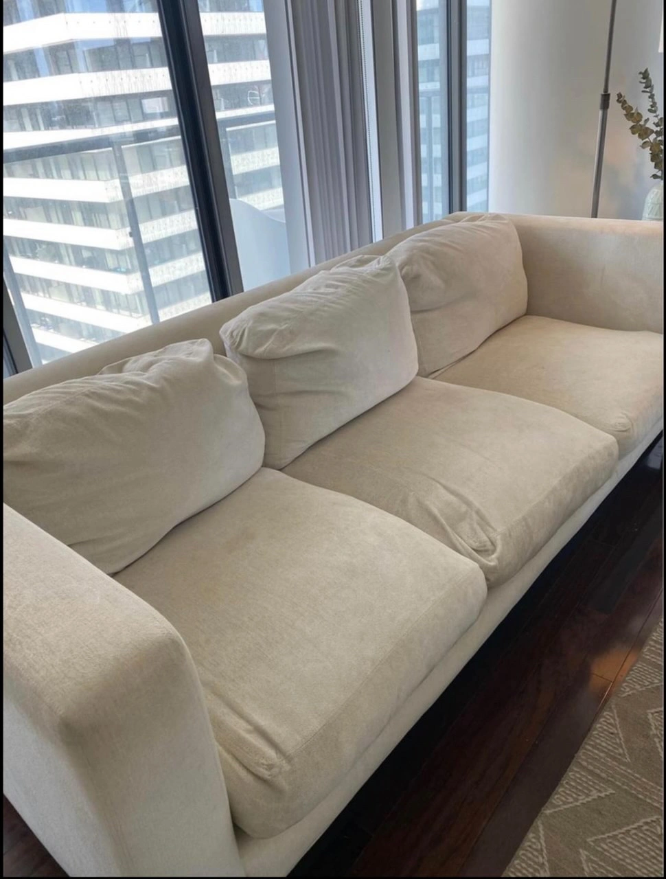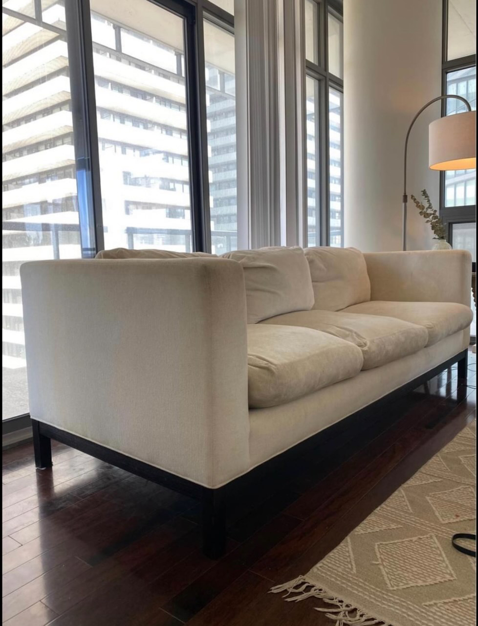 Selling a beautiful beige modern sofa with a custom design that will elevate any living space. This couch features a kiln dried ebony hardwood frame for durability and stability. The feather down filled cushions provide luxurious comfort, while the high quality body made of high density foam double wrapped in a layer of Dacron ensures long-lasting resilience against the elements. The custom woven upholstery adds a touch of sophistication.