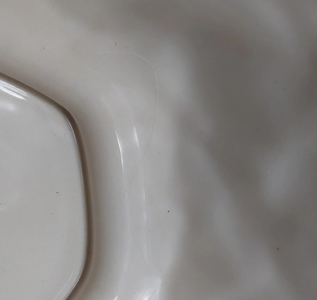 Approximately 8" round and 3" high. Looks almost new. Showing signs of the beginning of crazing of interior bowl, (see last photo)but not very noticeable.