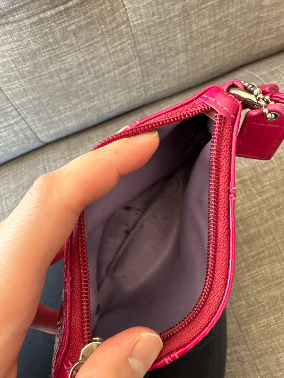 Gorgeous patent leather hot pink/magenta colour mix. Outside has no signs of wear. Inside has some makeup marks that I’m unsure if they can be removed.