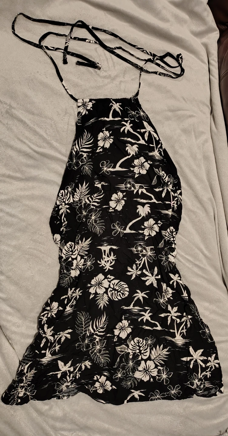 This black halter dress features a tropical floral and palm tree print. It's a size large with adjustable tie straps. Lightweight fabric for warm weather. Perfect for summer outings! Fits more like a medium.