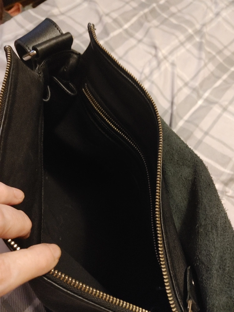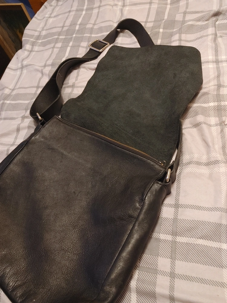 Leather laptop/messenger bag with adjustable shoulder strap. Front flap covers zippered opening. Suitable for a smaller laptop or tablet.