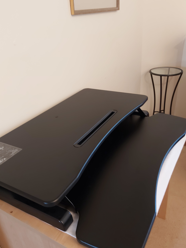 This sit-stand desk addition was purchased some months ago for $199. It is as new, hardly used. Solid and heavy enough to not slide off table.