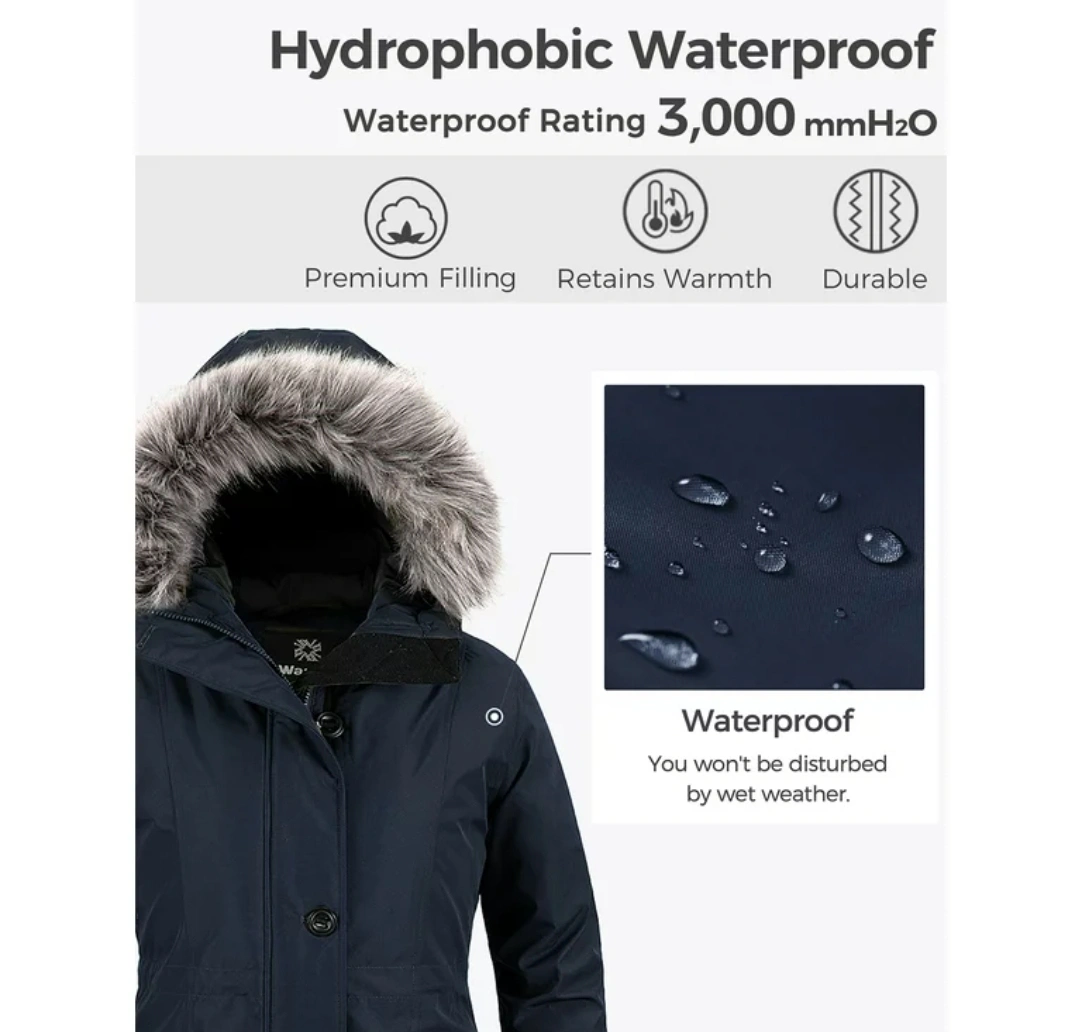 The outer fabric of the women's winter coat is windproof and waterproof, made from soft shell material to keep you dry and protected in harsh weather conditions.
